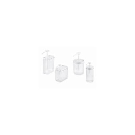 Die Behälter sind aus lebensmittelechtem Acrylglas mit weißem Deckel und Pumpspender gefertigt. Alle Bestandteile des Spenders lassen sich leicht unter fließendem, heißem Wasser abwaschen.