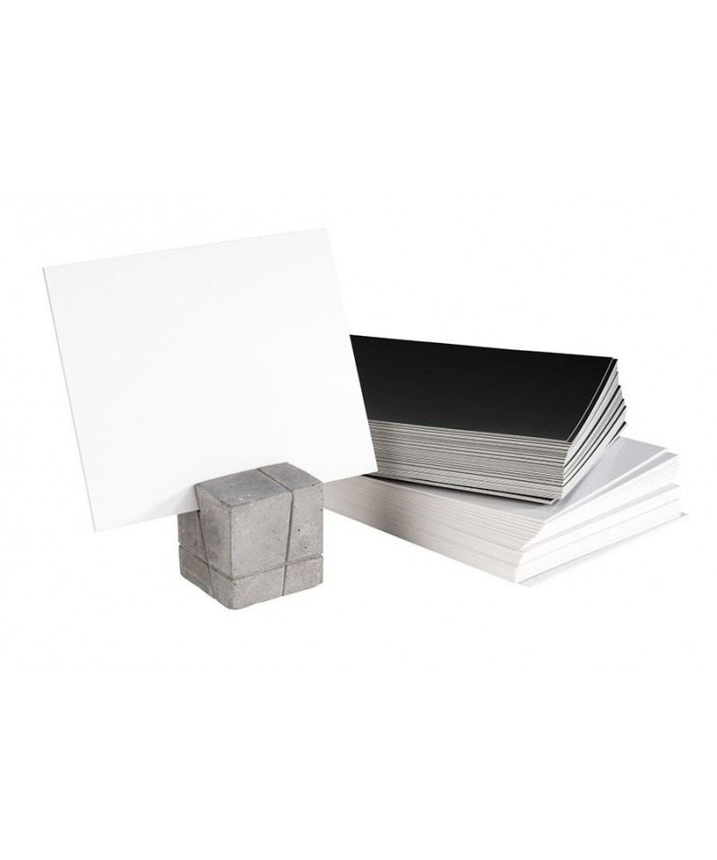 Set mit 4 würfelförmigen Betonständern und 30 Etiketten (15 weiße und 15 schwarze).