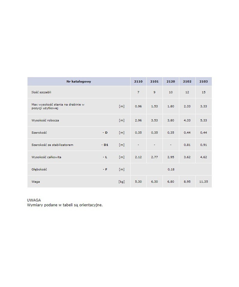 | Max. Stehhöhe auf der Leiter in Gebrauchsstellung [m] | 0.96 | 1.53 | 1.80 | 2.33 | 3.33 |