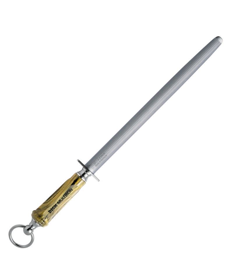 Der DICK MULTIRON vereint Präzisions- und Standardschnitt in einem einzigen Stahl. Bei leichtem Druck sorgt ein samtig-weicher Schnitt an der Messerschneide für ein sanftes Abziehen. Mit steigendem Druck nimmt der Abrieb der Messerschneide durch die kleinen Vertiefungen des Wetzstahls zu. Die feinen und gleichmäßigen Einschnitte im Stahl sorgen für ein gleichmäßiges Schärfen. MULTIRON hat eine ovale Form mit einer Länge von 30 cm.
