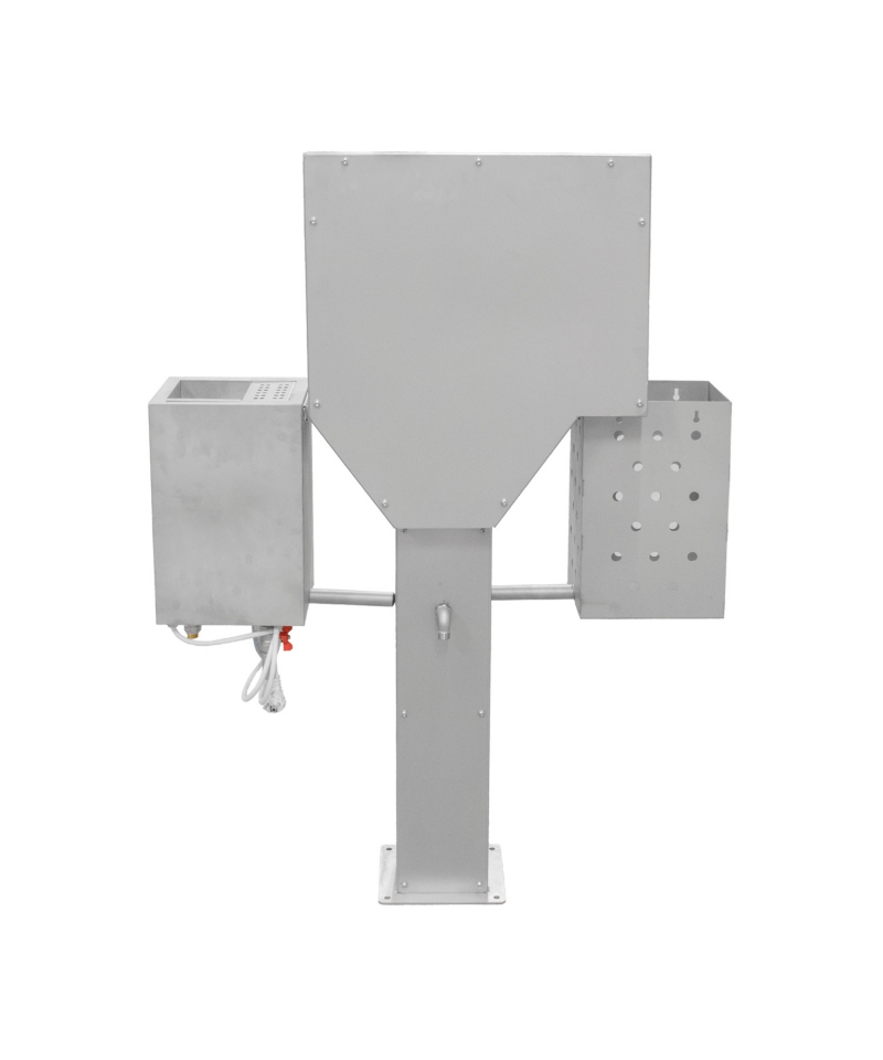 An industrial hygienic sink equipped with a fluid dispenser (soap or disinfectant), towel dispenser, used towel bin, and knife sterilizer. All made of stainless steel. Water flow activated by a knee switch located in the front part of the sink wall. The hand hygiene wall is fully equipped and the set includes a siphon, water mixer, spout, hoses, and knee valve.