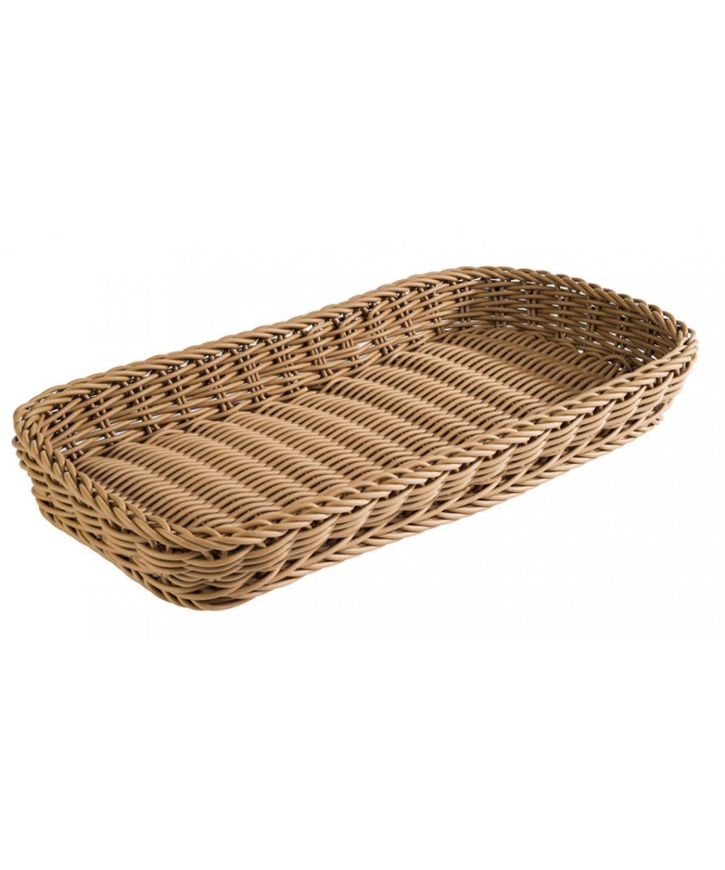 Rattan imitation polypropylene basket. The edges reinforced with a stainless steel rod make the basket more stable. Dishwasher safe and stackable.