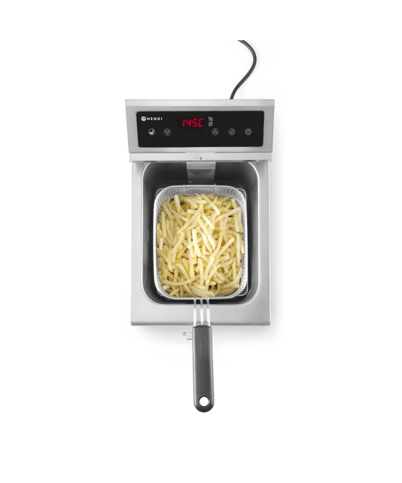 The Hendi deep fryer with an 8-liter capacity is a professional-grade solution combining the efficiency of induction technology with everyday practicality. Thanks to electromagnetic induction, the unit heats up quickly and maintains a stable oil temperature, ensuring uniform frying and energy savings. It's the perfect choice for foodservice operations that value reliability and performance.