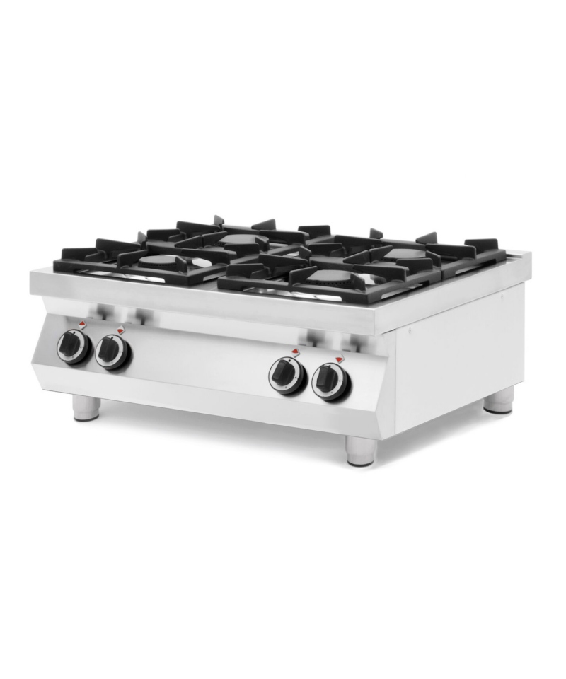 The cooktop is made of high-quality AISI 304 stainless steel, ensuring durability, corrosion resistance, and easy cleaning. The Hendi gas stove is designed for heavy-duty use, featuring robust cast iron grates (335×300 mm) that are easy to remove and clean. Burner units without spark igniters ensure long-term dependable operation.