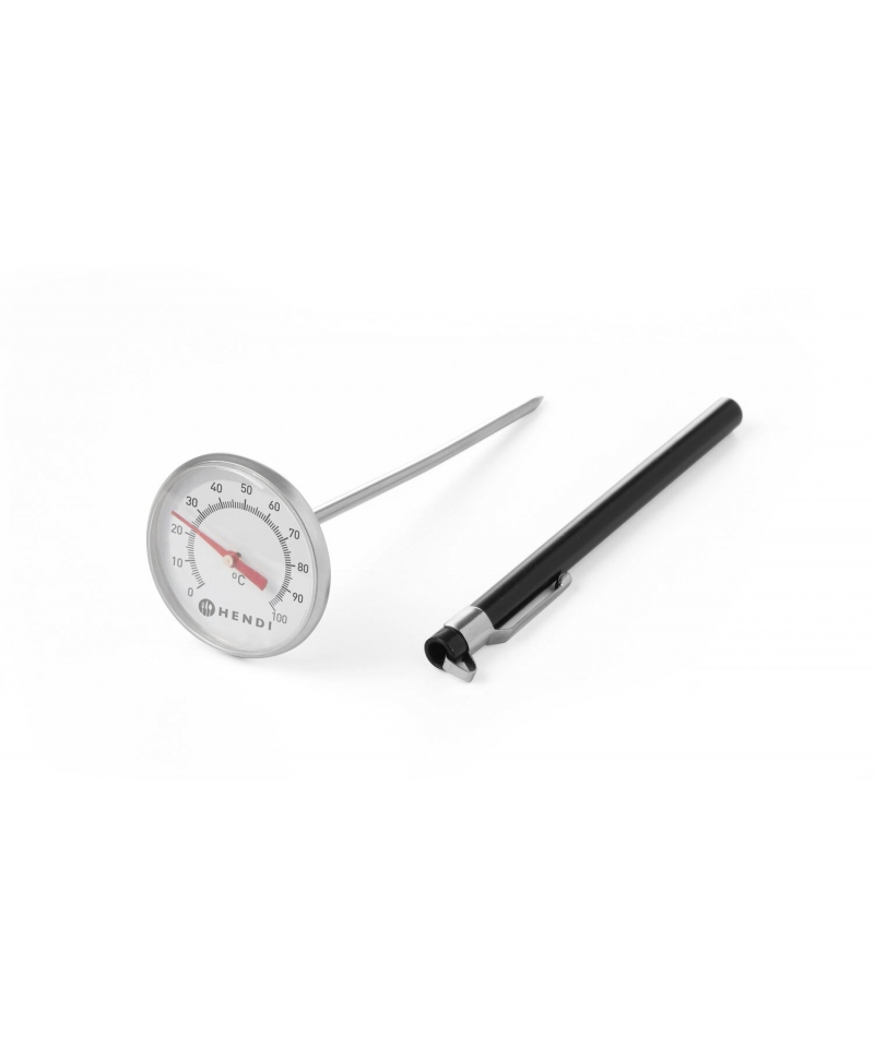 The HENDI brand probe thermometHENDI kitchen probe thermometer ø44.5x140 mm for precise food temperature measurement. Stainless steel probe, easy to use and hygienic.er is a reliable tool that will excel in any kitchen. With its precise temperature measurement ranging from 0ºC to 100ºC and solid stainless steel construction, it ensures not only accurate measurements but also durability and hygiene.