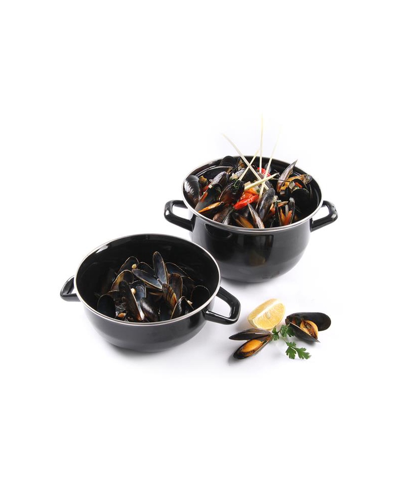 The HENDI mussel pot is a durable and stylish cookware designed for preparing and serving mussels and other seafood dishes. Made of stainless steel with a glossy black enamel coating and finished with a stainless steel rim. The included lid can also be used as a serving bowl.