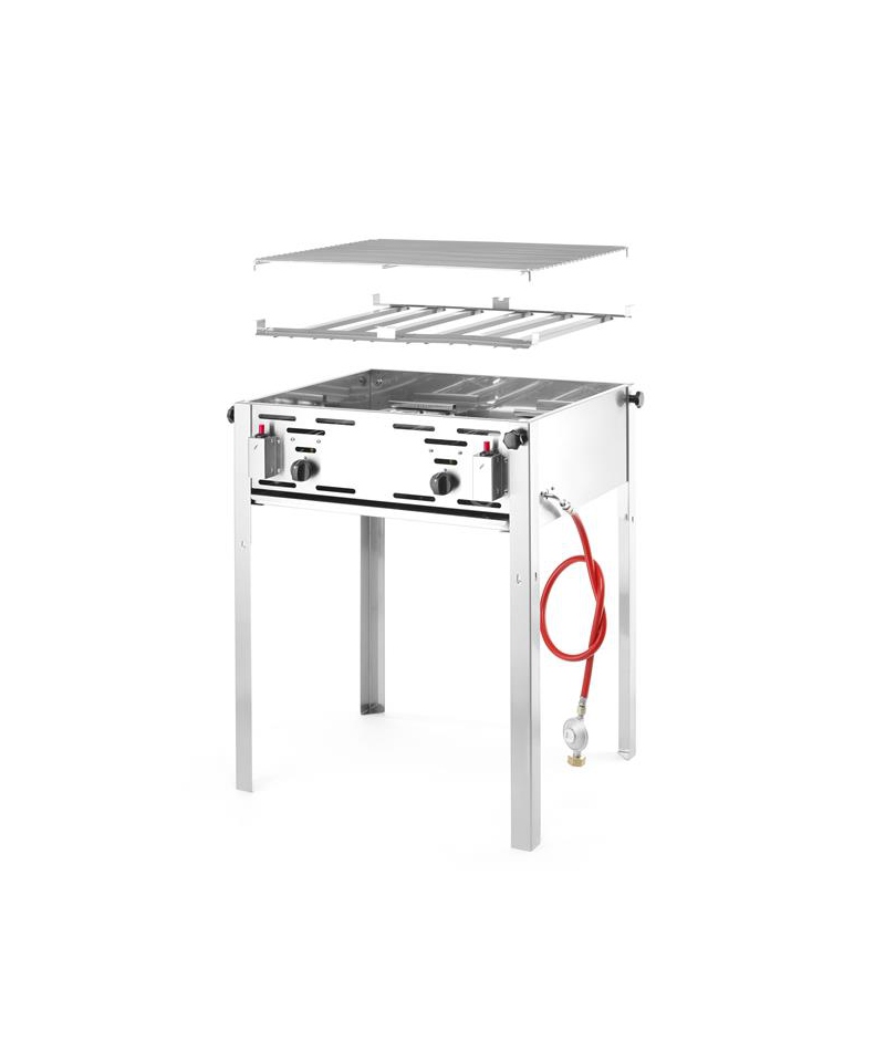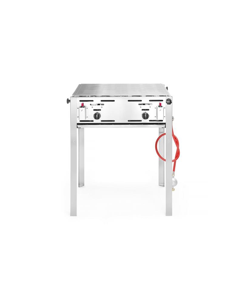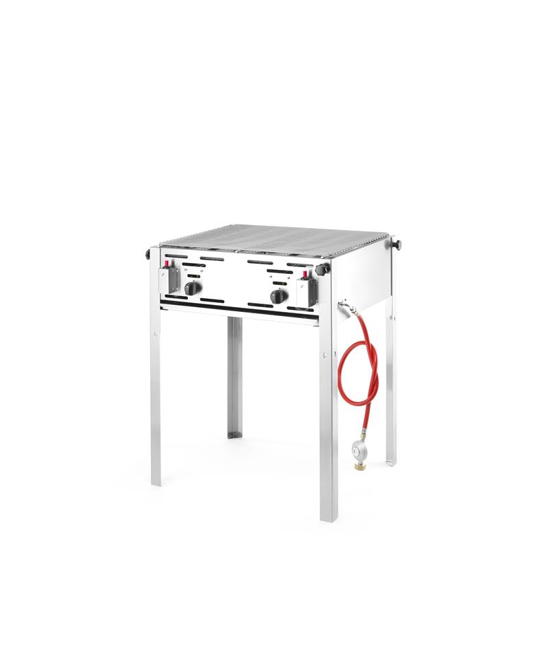 Bartscher gas lava grill is an efficient device with high power of 8 kW, perfect for grilling on two independent heating zones. It can operate on either natural gas type H or propane, making it flexible in use. The adjustable height of the grill grate allows for customization for different types of meat, and the sturdy stainless steel construction and included lava stones ensure durability and grilling efficiency.