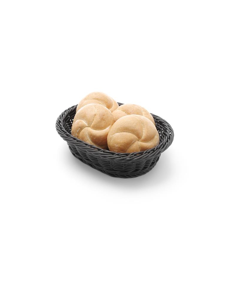 An elegant oval basket in black, measuring 250 × 190 mm, with a height of approximately 65 mm. Crafted from durable polypropylene, it is ideal for hospitality use—serving bread, rolls, snacks or as part of a buffet setup. Dishwasher-safe, facilitating high hygiene standards in restaurants, cafés and hotels.