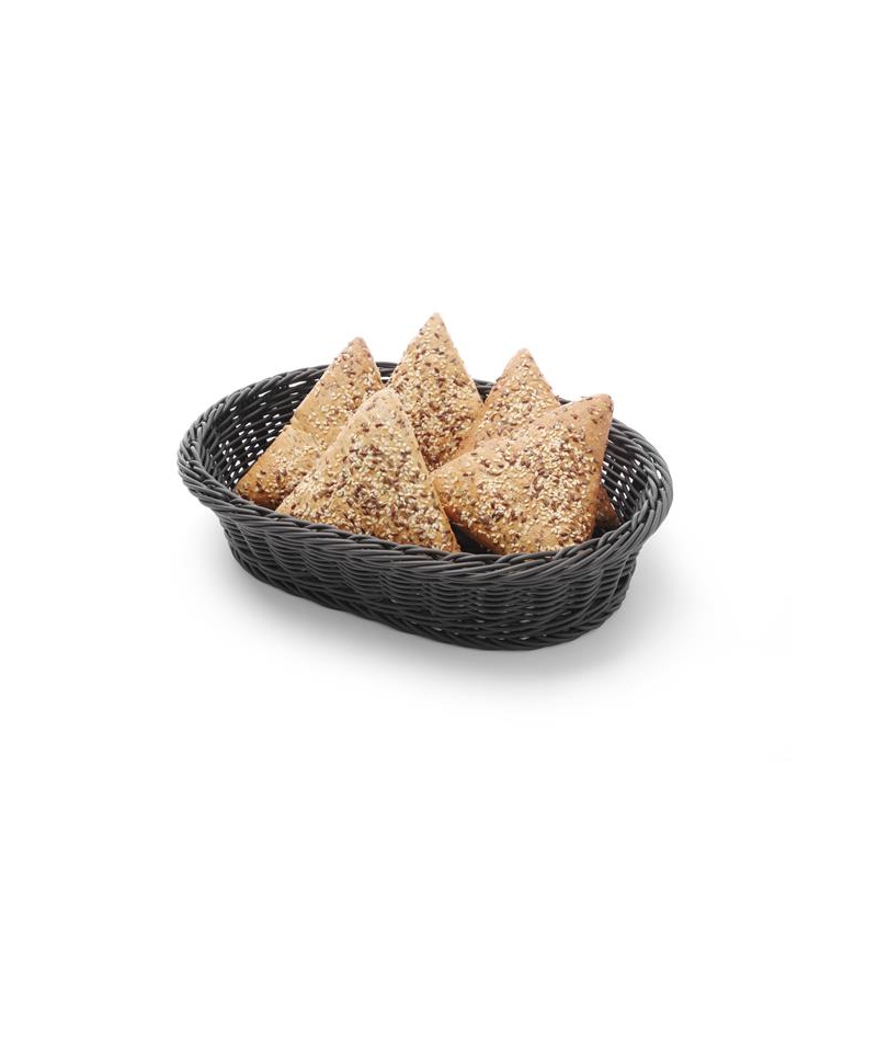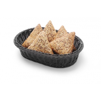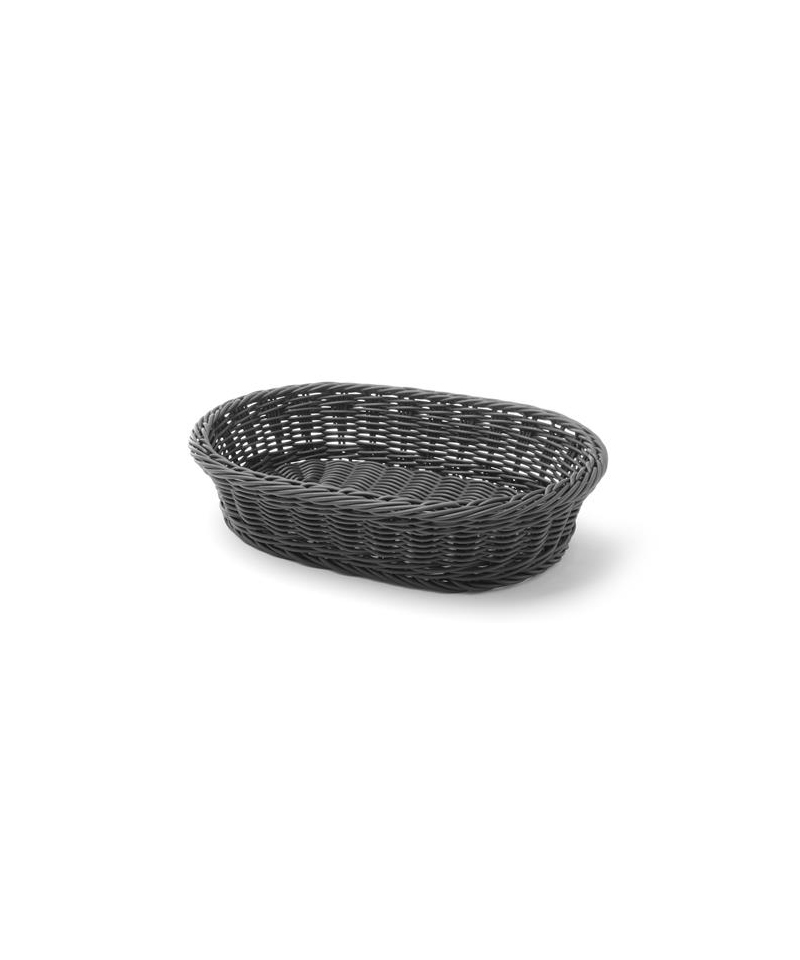 An elegant oval basket in black, measuring 320 × 230 mm, crafted from durable polypropylene. Perfect for serving bread, rolls, snacks or small dishes in restaurants, cafés and hotels. Its oval shape provides a distinctive look, while the material ensures easy cleaning and resilience for professional use.