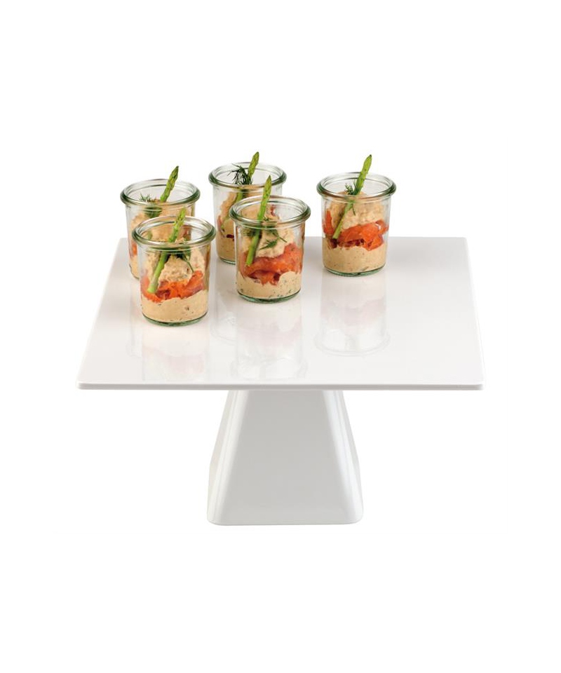 The stylish melamine cake stand (310 × 310 × 160 mm) is an excellent choice for presenting cakes, tarts and desserts in professional venues and sophisticated home settings. Made from melamine — a lightweight, durable material — it offers high performance and elegant presentation. The square 310 × 310 mm size gives ample display area, and the 160 mm height adds an upscale feel and enhances visibility of the served items.