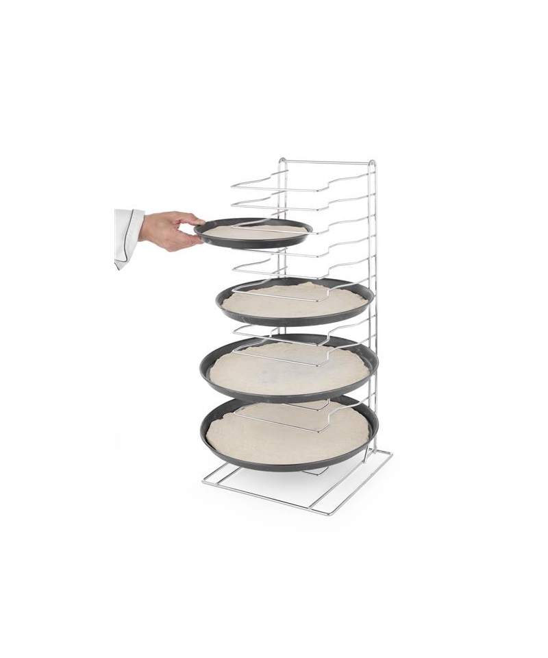 A durable and practical rack designed to store 14 pizza trays or screens. Made of chrome-plated steel, it provides excellent stability and long service life, even during intensive daily use. Its compact format helps optimize workspace and speeds up pizza preparation.