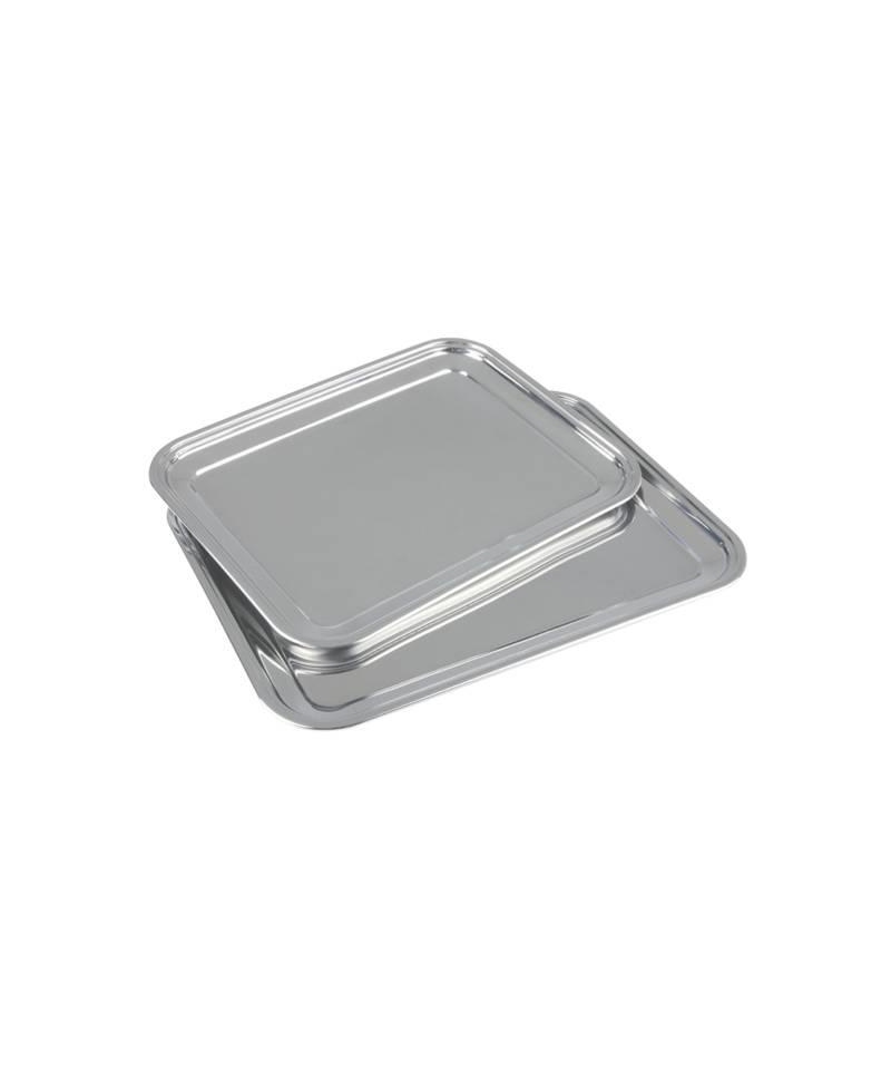 Serving tray with decorative rim. Made of 0.5 mm thick stainless steel. Dishwasher safe and stackable.