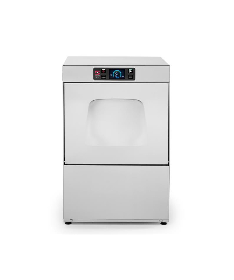 Housing made of AISI304 stainless steel. 3-stage filtration system: surface, reservoir and extraction - ensures that the washing water is maintained at optimal conditions and consistent washing performance. 4 surface filters made of stainless steel. Ergonomic design with rounded corners prevents dirt accumulation and facilitates cleaning. Electronic panel with intuitive color LCD display and IP65 protection. Built-in drain pump and rinse booster pump. Ability to select a program dedicated to washing a particular type of dishes - 6 programs. Dishwasher self-cleaning program and dishwasher emptying program. Soft Strat function for delicate dishes, such as glasses or goblets - gradual start of the washing pump. THERMAL LOCK function: rinsing dishes at the ideal temperature for sanitizing (87 degrees). Wash Plus+ function - the ability to increase the wash time by an additional 30 seconds. Energy saving system lowers the temperature of the boiler after prolonged rest time. Washing water temperature: from 40°C to 65oC. Rinse water temperature: from 65°C to 87oC. Boiler and tub safety thermostat: 85oC / 110oC. Comes with three baskets: universal, for plates - with pins and a small basket for cutlery 100x100mm. Supplied with 3/4" water supply hose and 30mm drain hose. NOTE: required assembly supplied without plug Dishwasher for 40x40 baskets. Upper and lower washing and rinsing arms made of plastic, with innovative HydrobladeTM technology, removable. Inlet height: 300mm. Maximum height of the dish to be washed: 300mm. Ergonomic handle integrated into the door housing. Start-up protection when door is open. 4 possible times to set: 90, 120, 150, 180 minutes; capacity of baskets per hour, according to the time: 40, 30, 24, 20; boiler capacity/power: 4.5 l/2.8 kW; Capacity/power of tub: 9 l/ 1.2kW. Rinse pump power: 250W (0.3KM). Water consumption per cycle: 1.9 l. Legs adjustable up to 1cm.