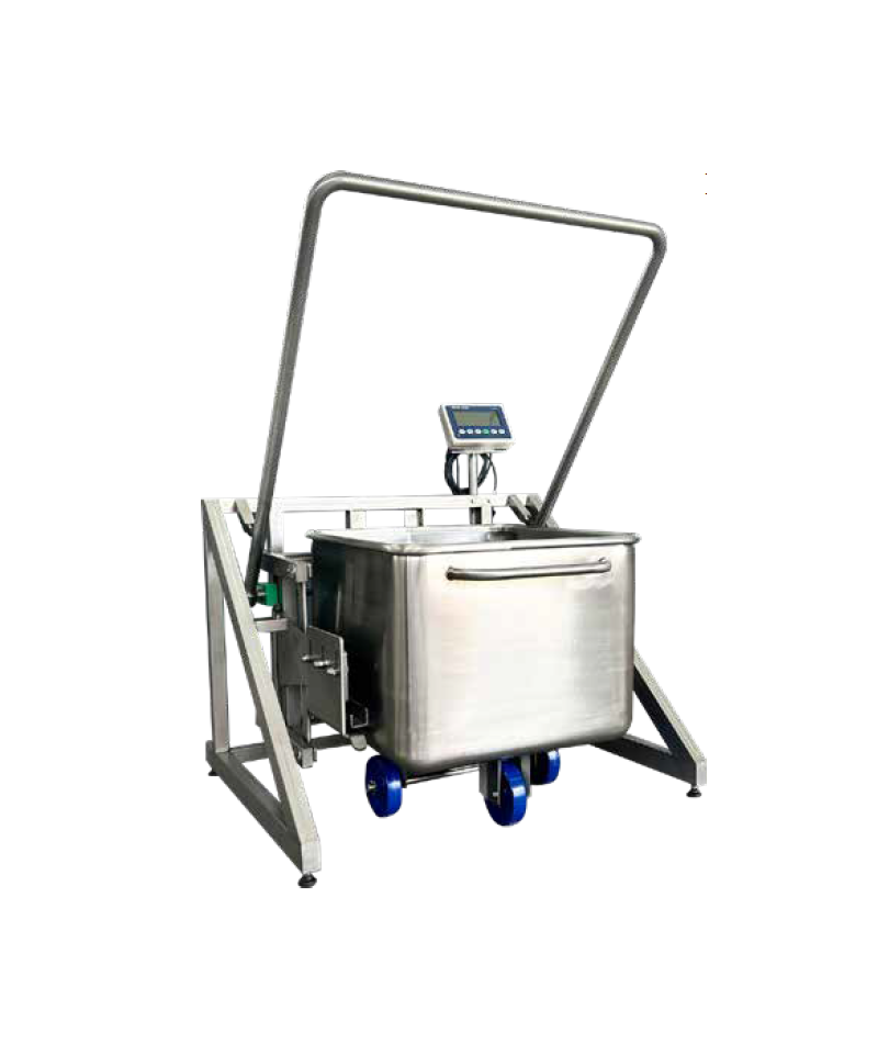 Emptying of trolley to machines, devices, tables or containers occurss as a result of lifting it to 1600 mm and tilting. The device is controlled by a ‘pick up/put down’ button. When it is pushed, the operation stops, accordingly to safety rules, the container remains in previous position. Additional buffering crane allows precise dosing and extends the emptying time. The device is provided with flanges for solid fixing (WT341) and wheels (WT342). On customer's request there is a possibility to produce tippler with lower or higher level of discharge.