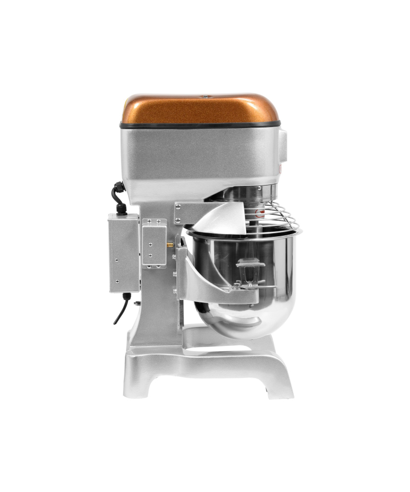 Designed for stability and durability, the mixer with dimensions of 680x460x370mm and a weight of 63kg guarantees robustness in any kitchen. Its body, made of high-quality aluminum and steel, presents elegantly in silver, complemented by a dome in a golden metallic shade, which facilitates cleaning. Crucially, the bowl and all additional accessories are made of stainless steel, certified for food contact.