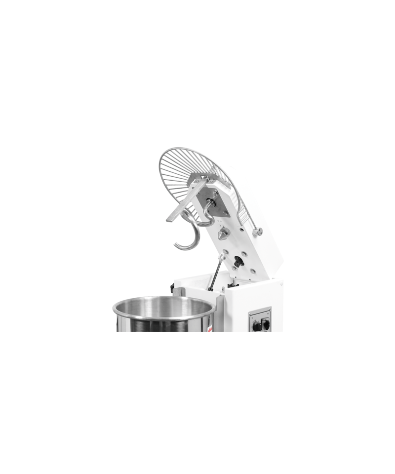 User safety is a priority: the mixer is equipped with advanced safety mechanisms, including a lock against starting with the head raised and automatic shutdown if the protective cover is attempted to be opened. Additionally, an integrated emergency stop switch allows immediate interruption of operation in emergency situations.