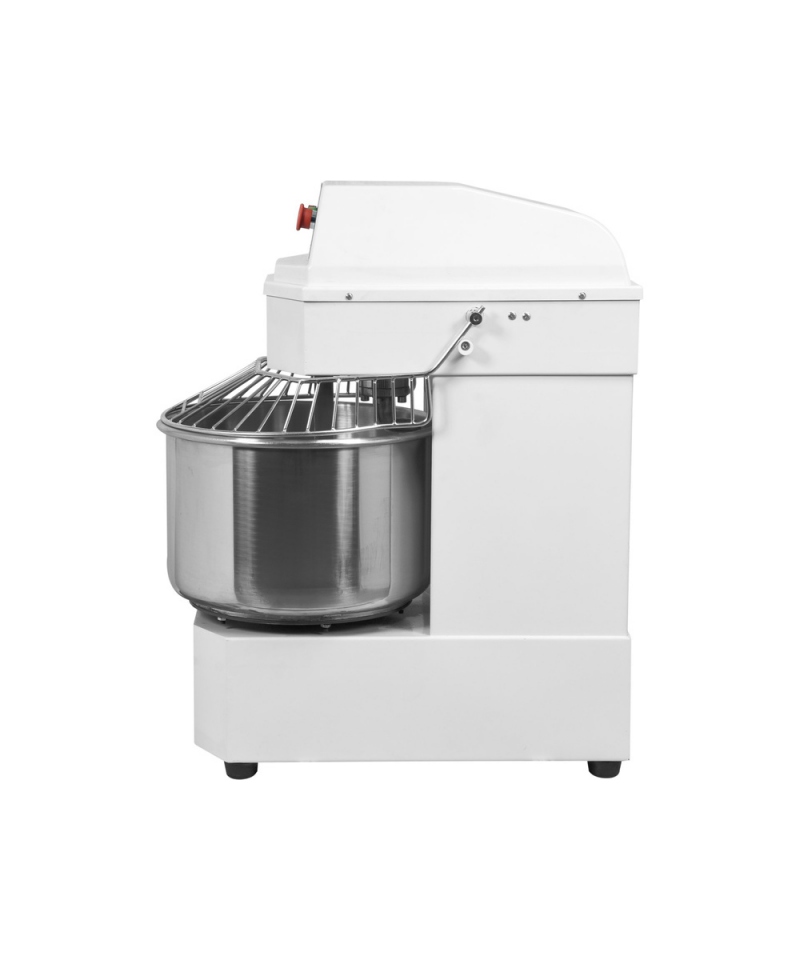 This robust mixer, with dimensions of 890x730x430mm and a weight of 97kg, guarantees stability during intensive operation. Its body, made of durable aluminum and steel, painted white, is not only aesthetic but also exceptionally easy to maintain hygienically clean. Crucially, the bowl and all accessories that come into contact with food are made of the highest quality stainless steel, certified for food use, ensuring safety and durability.