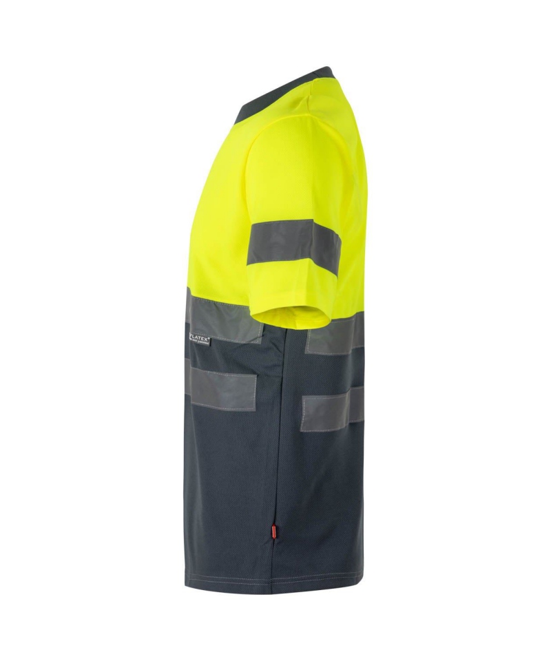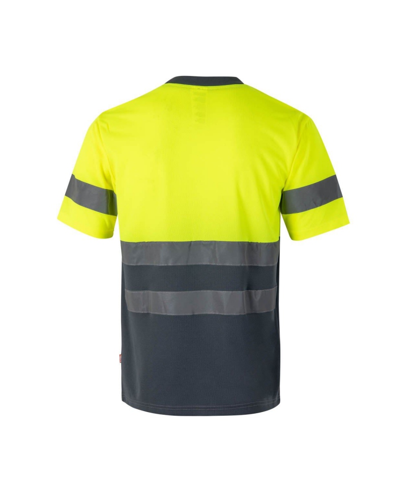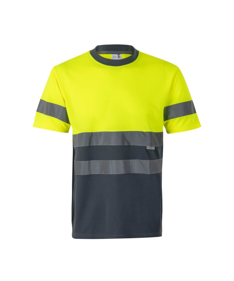 Two-tone high-visibility technical T-shirt with short sleeves, made of lightweight Bird-Eye polyester (140 gsm). Features reflective tape on torso and sleeves, contrast ribbed neck, and chevron neck reinforcement. Certified to EN 20471 (Class 1)
