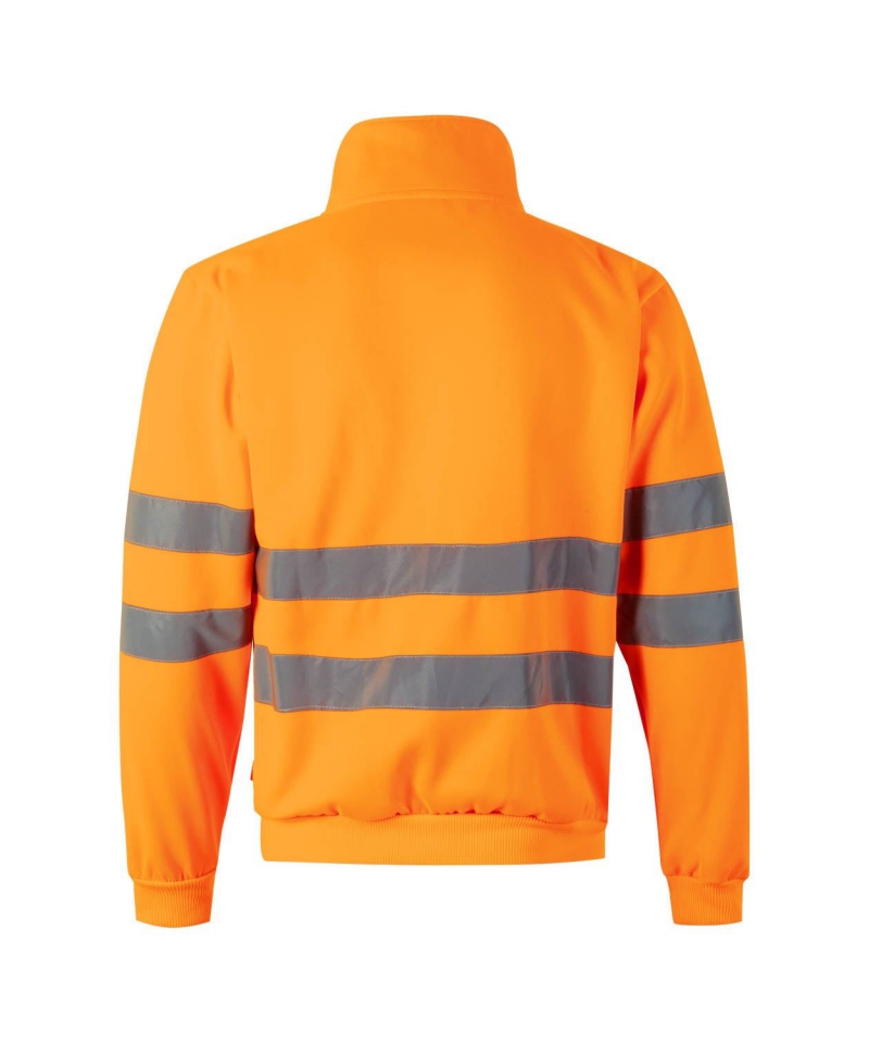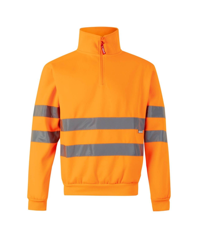 Half-zip sweatshirt with turtleneck collar. Reflective tape on torso and sleeves ensures visibility. Ribbed cuffs and waistband. Plush knit fabric, 100% polyester, 300 gsm. Certified EN 20471 (Class 2)