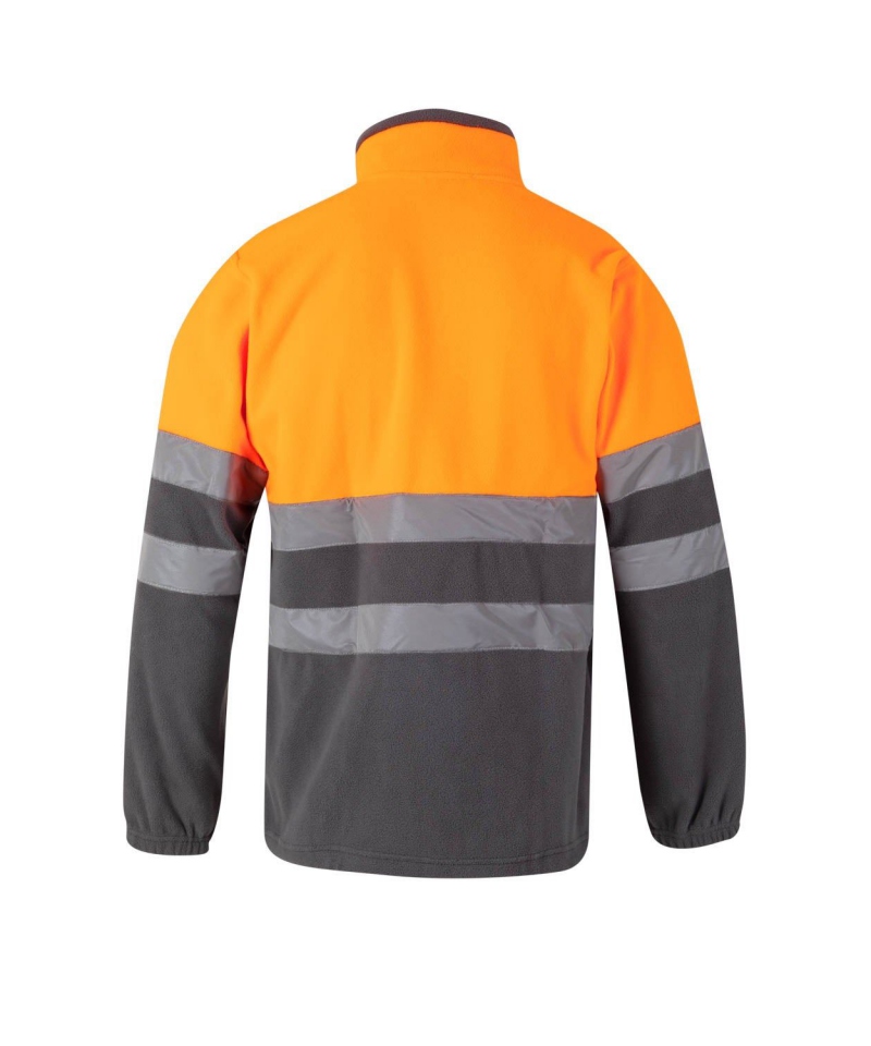 Two-tone fleece jacket made of 280 gsm warm polyester fleece. Features include a full zip, three zippered pockets, reflective tape for visibility, and an adjustable hem. Certified to EN ISO 20471 (Class 1) for high-visibility workwear