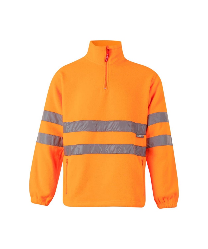 High-visibility fleece pullover with zip collar, made of durable 280 gsm fleece. Reflective tape on torso and sleeves ensures Class 2 visibility. Elastic cuffs and adjustable bottom for comfort and fit.
