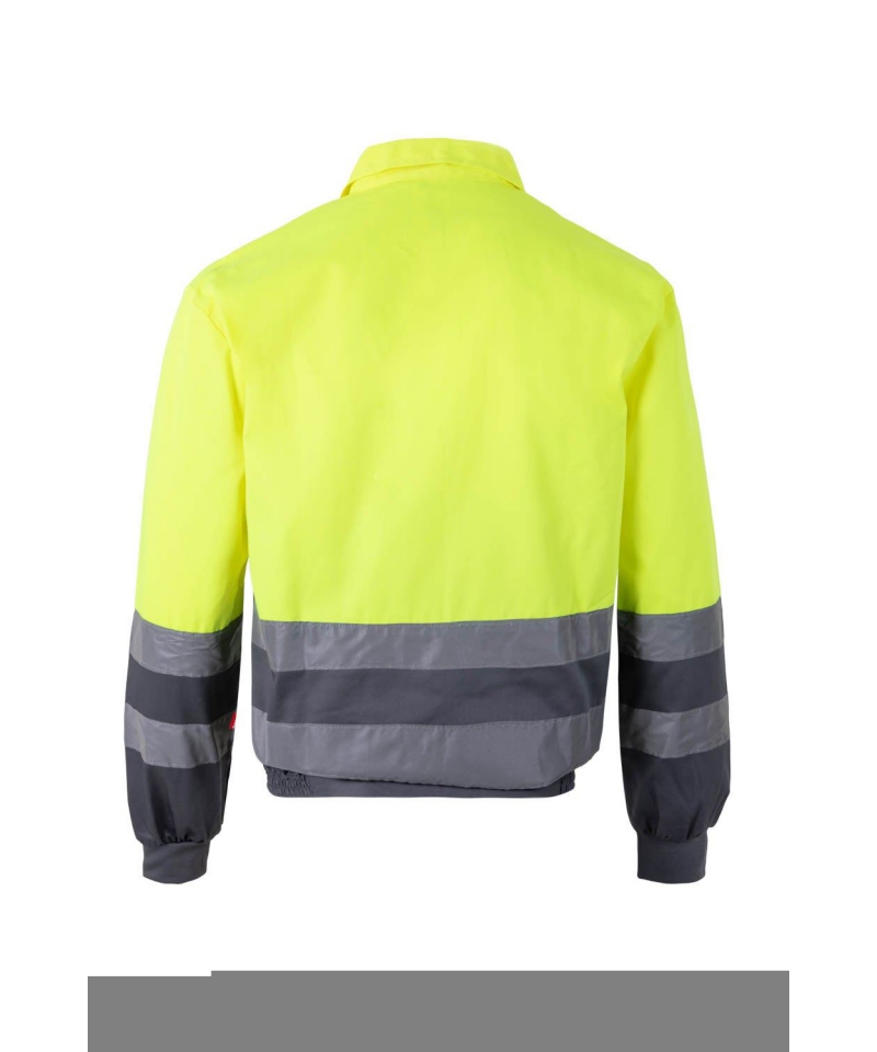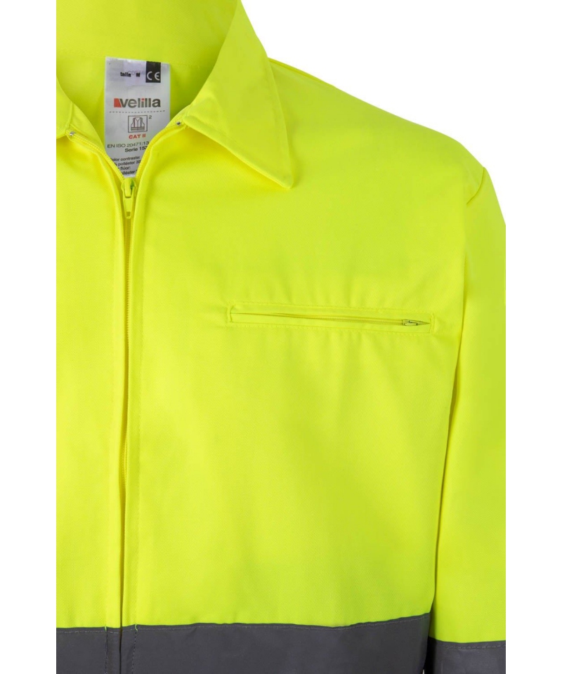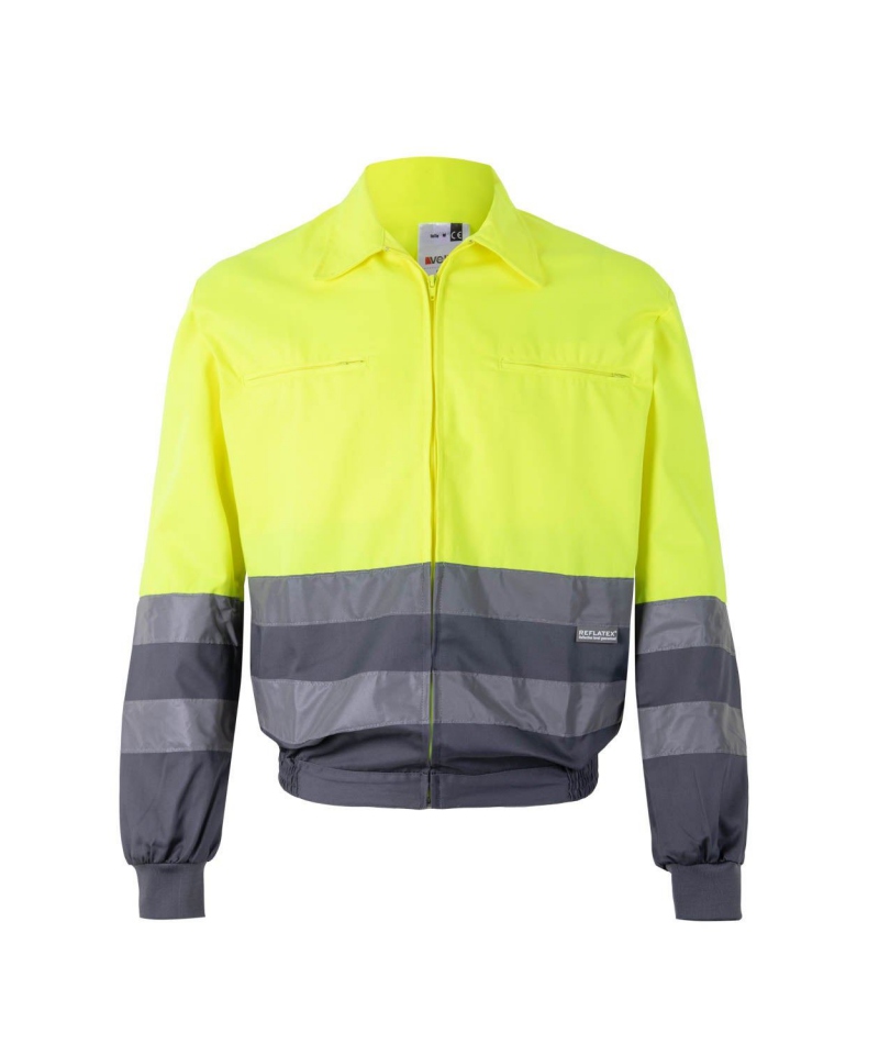 Two-tone high-vis jacket with REFLETEX® tape, zip pockets and elastic fit. Polyester-cotton mix. Certified EN 20471 Class 2.