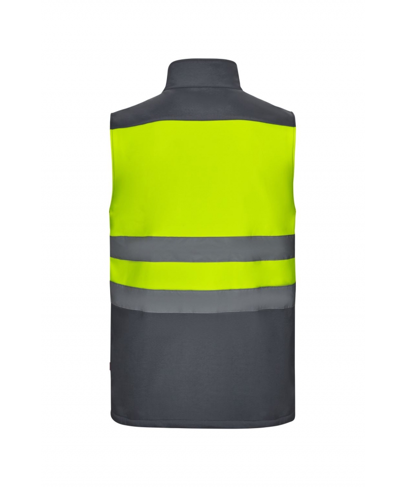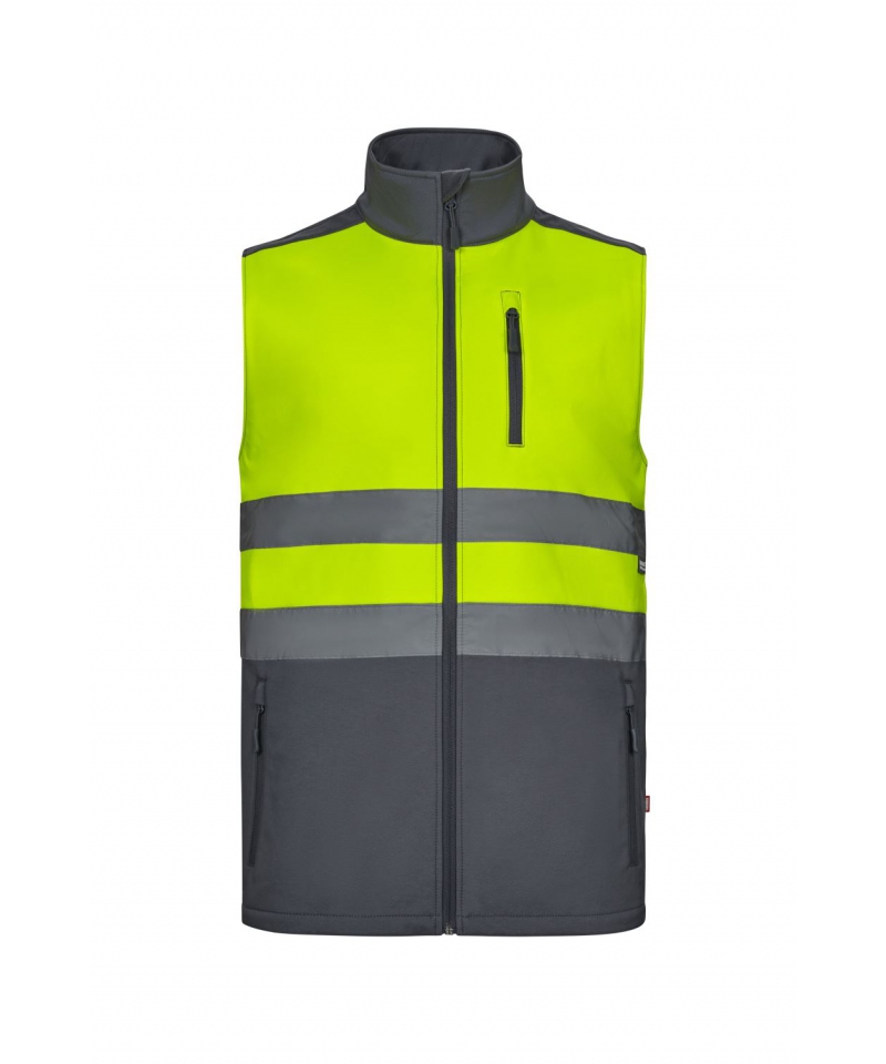 Two-tone high visibility softshell vest with fleece lining and TPU membrane. Provides wind protection and comfort, certified to EN 20471 Class 1. Features include 5 practical pockets, contrast front zip, and reflective bands on the torso. Available in various colours and sizes (S–5XL).