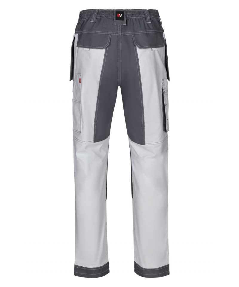 Durable canvas work trousers with elastic waistband, 10 functional pockets, and reinforced knees and back. Heavy-duty 290 gsm fabric. Designed for intense work environments.