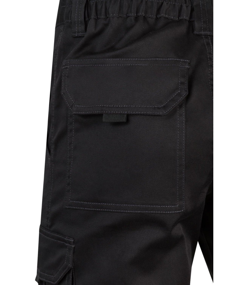 An elastic waistband ensures a secure yet comfortable fit, adapting to your body without restricting motion. Reinforced with a central zip and button closure and double safety seams, the construction is made to withstand intensive daily use. The contrast stitching adds a distinctive touch of style to a highly functional garment.
