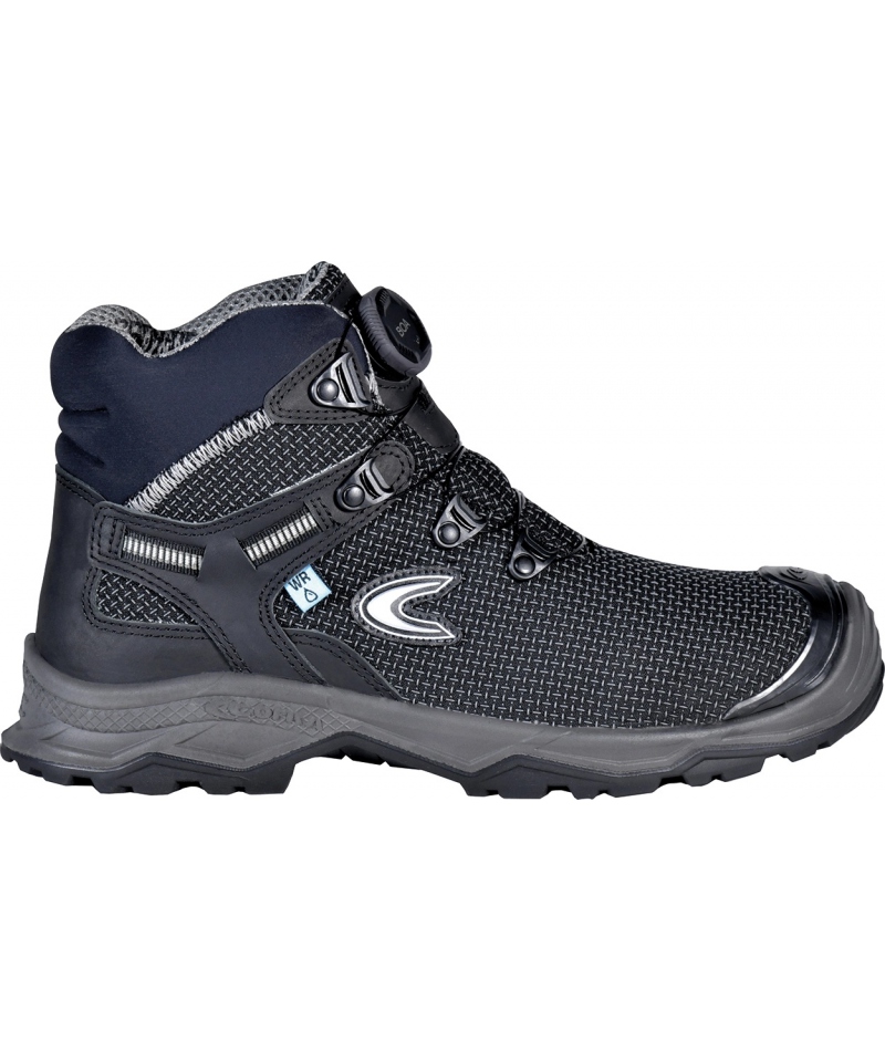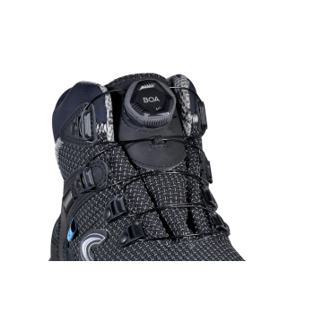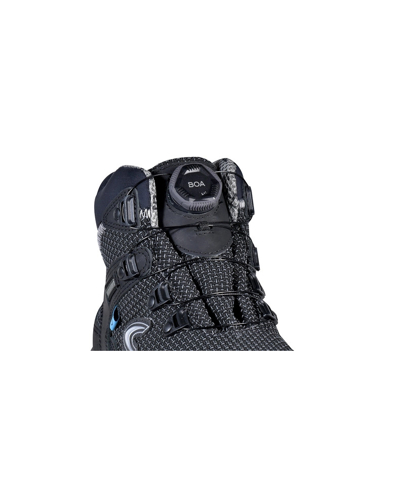 The BOA® Fit System enables fast and precise adjustment without traditional laces, enhancing performance and eliminating discomfort. The polyurethane and nitrile rubber outsole delivers exceptional grip and flexibility, while offering protection from surface heat up to 300°C on brief contact. The outsole is also certified with LG for safe use on ladders and SC for toe abrasion resistance well above standard requirements. A special polycarbonate and fiberglass support placed between the heel and sole protects the arch and prevents injuries caused by harmful flexion or twisting.