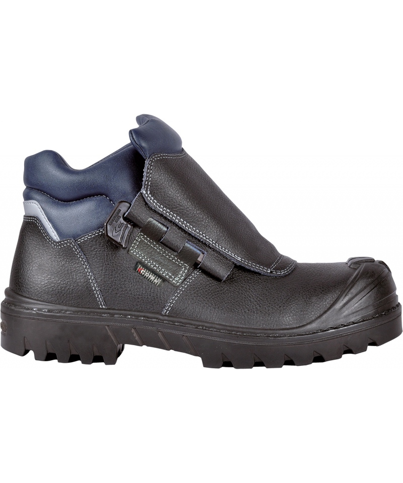 The thermoformed EVANIT insole, made from a blend of EVA and nitrile, offers anatomic support and varying thickness for enhanced comfort. Its antistatic properties ensure safe wear in sensitive work environments. A non-metallic TOP RETURN toecap rated to withstand 200 J and a puncture-resistant APT PLUS plate deliver effective foot protection. The HEAT DEFENDER PU/nitrile rubber outsole withstands temperatures up to 300°C for one minute and remains flexible in cold down to -25°C. A polycarbonate and fiberglass support structure stabilizes the arch, while a specialized tread pattern provides secure grip on ladder rungs. Fire-resistant stitching, reinforced toe protection and a quick-release system increase functionality.