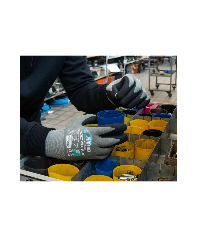 The PHOENIX gloves from the Mechanical Protection line are an eco-friendly reusable solution that combines mechanical protection with user comfort. They are made from nitrile foam and water-based polyurethane completely free from DMF ensuring safe and skin-friendly use. The 15-gauge weave made from next-generation recycled yarn and a recycled polyester and spandex liner provide flexibility softness and durability while maintaining full traceability of the material according to GRS.