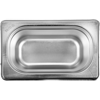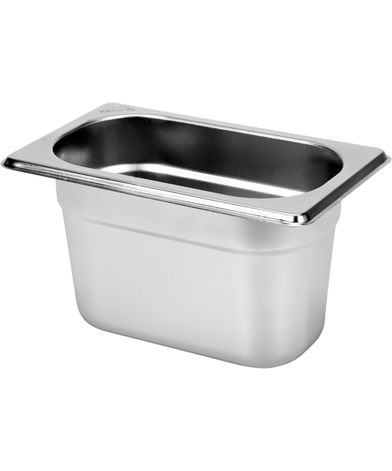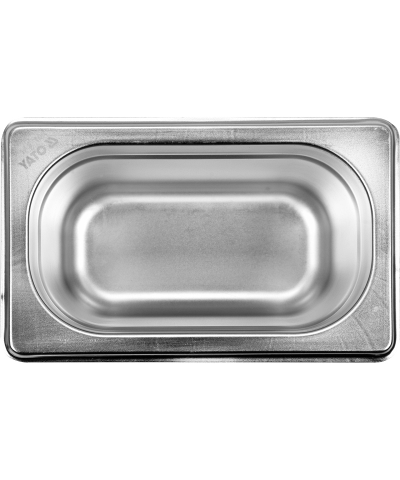 We present a professional stainless steel gastronomic container, in standard GN 1/9, with a depth of 100 mm and a capacity of 0.9 l. Gastronomic containers from YATO Professional Kitchen Equipment brand were created with intensive, professional use in gastronomy in mind, proving ideal for mass catering establishments. Made of highest quality 201 type stainless steel, they feature a matte, smooth surface and are fully compliant with the rigorous GASTRO NORM PN-EN 631-1:1996 standardization. Designed for versatile use, GN containers are perfect for storing food in both refrigeration and freezing conditions – down to -40°C, as well as at high temperatures – up to 300°C. This wide temperature tolerance allows for their safe use in combi steam ovens. They are distinguished by exceptional resistance to mechanical damage, as well as to organic acids and strong detergents. Thanks to these properties, they are fully adapted for dishwasher cleaning and show high tolerance to intensive scrubbing, which guarantees easy maintenance of hygiene. With attention to every detail, the containers have precisely rounded corners and smooth edges, which significantly increases safety and hygiene of use, minimizing the risk of cuts and facilitating cleaning. A special embossing around the perimeter of each container further strengthens its construction, effectively protecting against deformations and dents resulting from daily use, and also enabling stable and safe stacking.