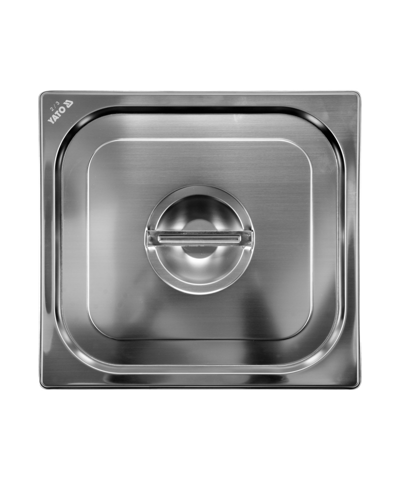 We present a lid for a YATO GN container, size 2/3, made of high-grade stainless steel. It is an ideal complement to the line of professional gastronomic containers from YATO Professional Kitchen Equipment, fully compliant with GASTRO NORM PN-EN 631-1:1996 standardization. The lid is made of the highest quality 201 type stainless steel, characterized by a matte, smooth, and hygienic surface.