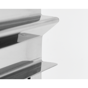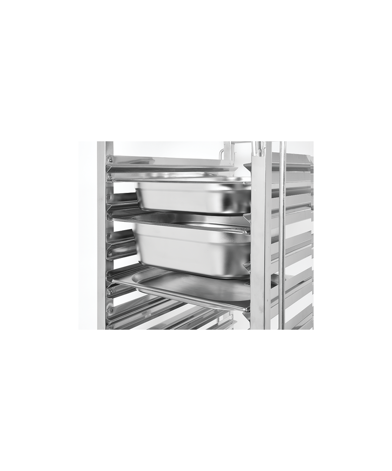 The trolley's construction is based on **high-quality 201 type stainless steel**, which provides it not only with **exceptional corrosion resistance** but also **long-lasting utility values and easy hygiene maintenance.** The **solid construction with 0.9 mm thick profiles** guarantees **unrivaled stability**, and each shelf is capable of supporting a load of up to **40 kg.** Innovative guides, spaced every **80 mm** and featuring a **special M-shaped design**, securely hold GN containers in place. This unique profile also allows for **additional adjustment** of the distance between levels by **20 mm**, increasing usage flexibility. Additionally, **special, intuitive-to-use locks** have been integrated on both sides of the trolley, effectively securing containers against accidental sliding out during movement.