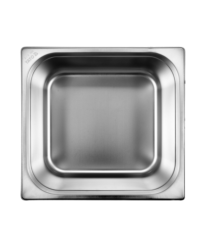 Discover the professional YATO GN container, made of high-quality stainless steel, with standard dimensions of GN 2/3 and a depth of 150 mm, offering an impressive capacity of 12.0 l. These gastronomic containers from the YATO Professional Kitchen Equipment line were created for intensive, professional use in gastronomy and mass catering establishments. Made from top-quality 201 type stainless steel, they feature a matte, smooth surface and fully comply with the rigorous GASTRO NORM PN-EN 631-1:1996 standardization. They are indispensable for storing food in refrigerated and frozen conditions, withstanding temperatures down to -40°C. They perform equally well at high temperatures, up to 300°C, allowing for their safe use in convection-steam oven technology. They are distinguished by exceptional resistance to mechanical damage, as well as to organic acids and strong detergents. This makes them fully suitable for dishwasher cleaning and resistant to intensive surface scrubbing, which guarantees easy maintenance of hygiene. Special attention has been paid to details such as perfectly rounded corners and smooth edges, which not only enhance safety but also facilitate maintaining the highest level of hygiene during use. A special embossing around the perimeter of each container significantly strengthens its construction, effectively protecting against deformation during intensive use and enabling stable and safe stacking.