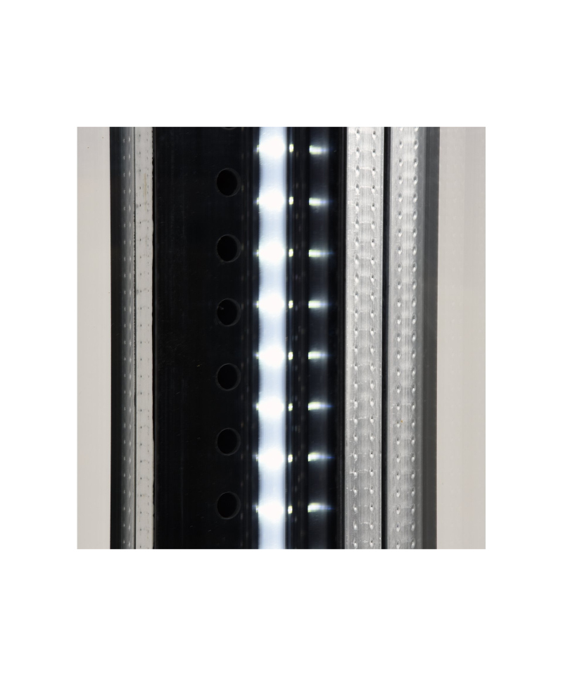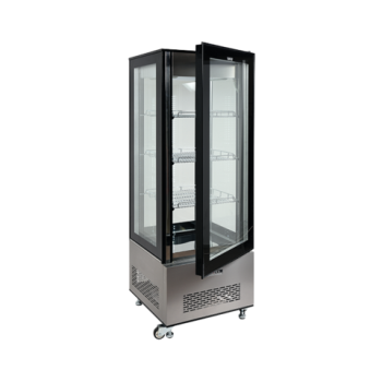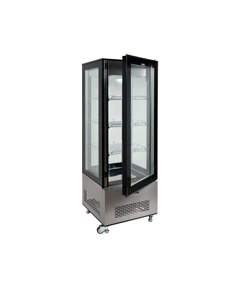 We present the freestanding YATO refrigerated display cabinet with a capacity of 400L in an elegant black finish, with dimensions of 650x650x1908mm. This YATO refrigerated display cabinet is ideal for the effective display of a wide range of products, from exquisite cakes and pastries, fresh cocktails and yogurts, to refreshing drinks, salads, and appetizing snacks. The combination of modern design with the highest quality materials makes the YATO display cabinet a perfect complement to the interiors of patisseries, cafes, restaurants, and various retail outlets, attracting customers' attention. Integrated, four-sided LED lighting perfectly highlights the aesthetic qualities of the displayed products, making them even more enticing to customers. In addition to its impressive 400L capacity, the YATO display cabinet is equipped with two reinforced, chrome-plated shelves with adjustable height, allowing for flexible space management. Easy access to the interior is provided by openable glass doors. All glass panels – front, sides, and doors – are made of double-layered tempered glass, which guarantees exceptional durability and excellent thermal insulation. The display cabinet maintains a stable temperature range from 0°C to +12°C, utilizing ecological R290 refrigerant. The applied forced cooling technology combined with the automatic defrosting function guarantees not only exceptional efficiency but also significant energy savings. Forced cooling ensures an even temperature distribution on every shelf, which is crucial for product freshness. The average annual energy consumption is just 2002 kWh. Operating the display cabinet is intuitive thanks to an electronic controller with a clear temperature display. A convenient power switch allows for quick turning on or off of the device at any time, eliminating the need to unplug it from the mains. The YATO display cabinet with a power of 636W and dimensions of 650x650x1908mm, despite its considerable size, offers exceptional ease of positioning and relocation. The innovative 360° wheel design allows for effortless repositioning of the device. Additionally, adjustable feet ensure stability and precise leveling of the display cabinet in any location.