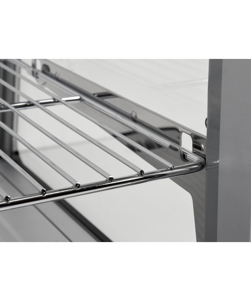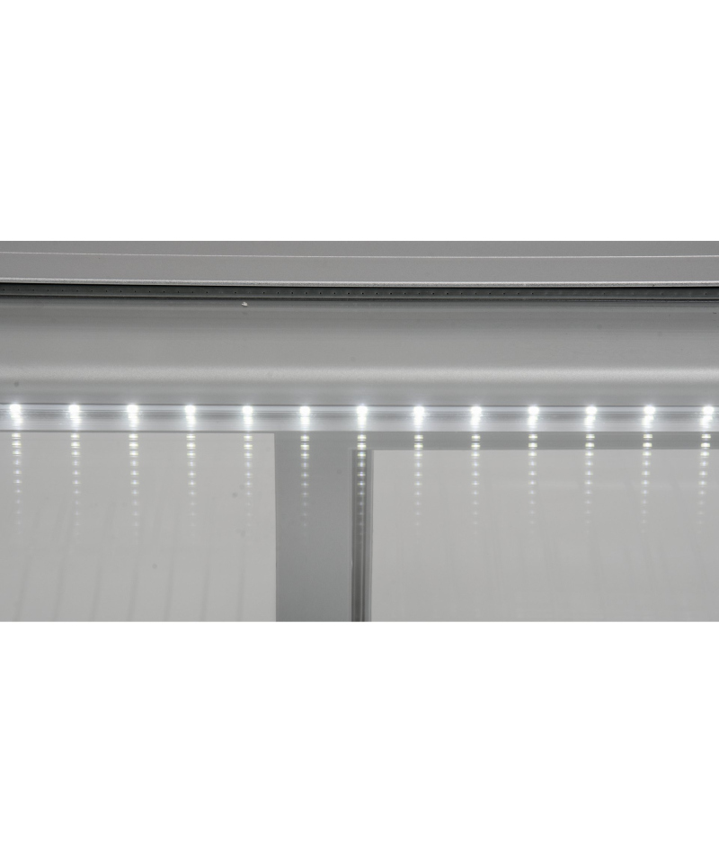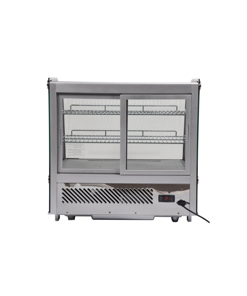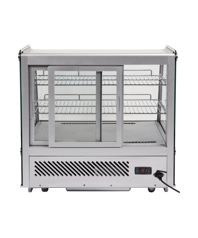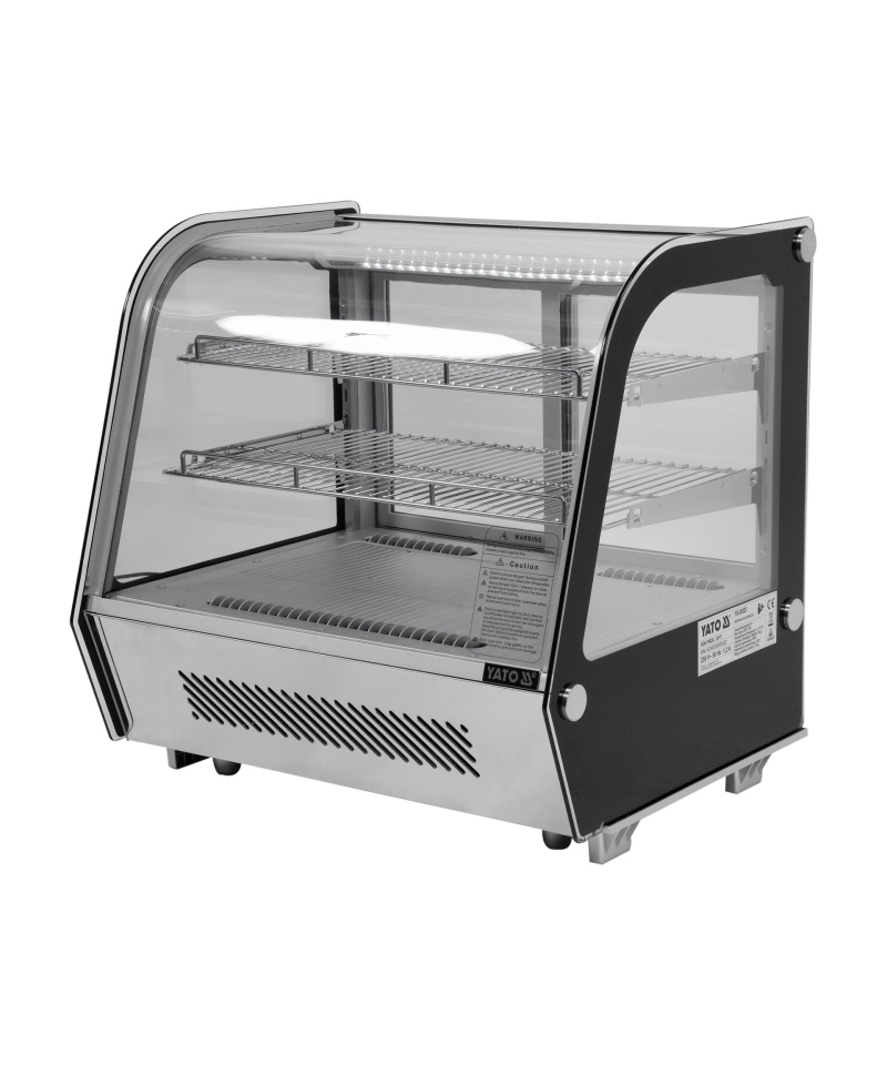 Discover elegance and functionality with the adjustable YATO refrigerated display case with a capacity of 120L, in a stylish silver finish. Ideal for the impressive presentation of cakes, tarts, desserts, cocktails, and beverages, the YATO display case combines modern design with reliability. Thanks to the use of high-quality materials and thoughtful design, the display case perfectly fits the aesthetics of patisseries, cafes, restaurants, and other retail outlets, becoming their showcase. Integrated, energy-efficient LED lighting perfectly highlights the freshness and appetizing appearance of products, effectively attracting customers' attention and encouraging purchases. This compact 120L refrigerated countertop display is equipped with two chrome-plated shelves with adjustable height, allowing for flexible adaptation of space to various products. Easy access to the interior is provided by sliding doors made of tempered glass. Similarly, the panoramic, rounded front glass, also made of tempered glass, guarantees not only excellent visibility but also exceptional durability and optimal insulation properties. The device maintains a stable temperature range from 0 to +12°C, using the ecological refrigerant R600a. Advanced static cooling technology with an upper evaporator nozzle, supported by an automatic defrost function, guarantees not only high operational efficiency but also significant energy savings. The average annual energy consumption is 1141 kWh. Precise control of the device is enabled by an intuitive electronic controller with a clear temperature display.