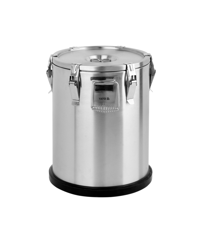 The thermal insulation container is equipped with two sturdy, stainless steel handles, significantly facilitating transport, and six durable latches, securely closing the lid. The high quality and durability of these components guarantee many years of trouble-free use. Additionally, the bottom of YATO thermoses is protected by a rubber pad, which effectively prevents slipping on surfaces during transport.