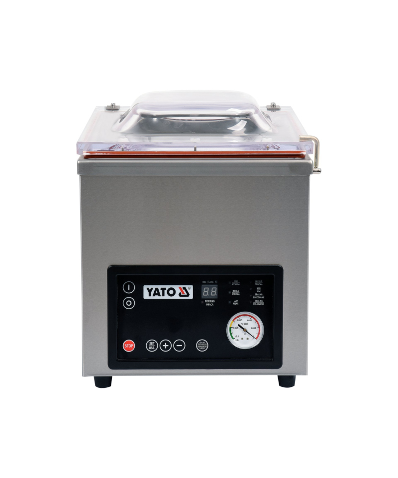 The YATO vacuum sealer has been designed with durability and hygiene in mind, made from the highest quality raw materials. The vacuum chamber, measuring 370 x 320 x 135 (185) mm, is made of thick and solid stainless steel, ensuring an exceptionally long service life. Its rounded shapes significantly facilitate maintaining perfect cleanliness. The transparent lid of the sealer, made of very massive plastic, allows for continuous monitoring of the packaging process and full control over it. Additionally, a special recess in the lid increases the chamber height from 135 mm to 185 mm, which enables packaging even larger products.