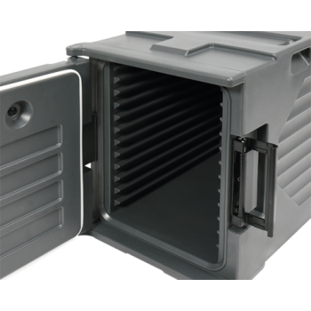 The interior of the container, measuring 335 x 533 x 490 mm, is equipped with 12 precisely embossed guides. This allows for safe and organized transport of food in stainless steel, polycarbonate, or polypropylene containers, fully compliant with GN standardization: