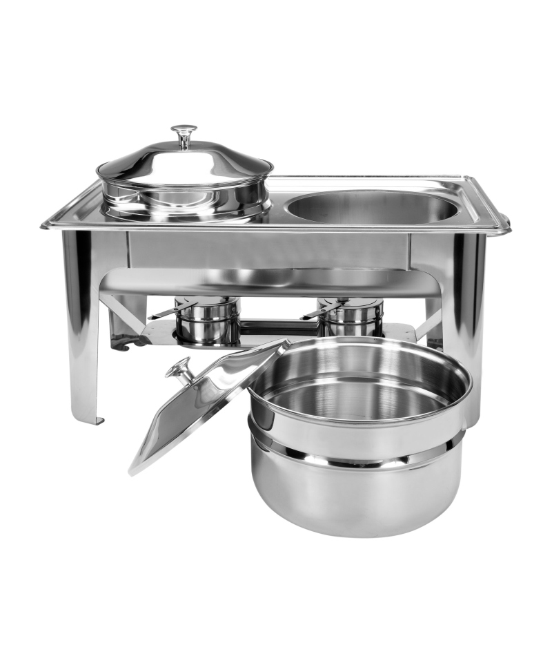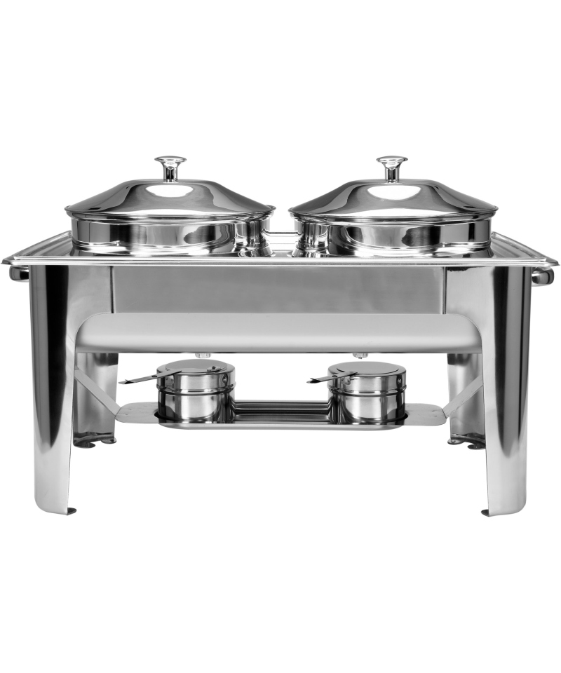 The set includes two chafing dishes with lids, made of stainless steel, each with a diameter of 220mm, a height of 140mm, and an impressive capacity of 4.5L, ideal for serving a variety of dishes. The warmer is also equipped with two fuel paste containers and a special mount that allows for optional installation of an electric heater, increasing the versatility of the device.