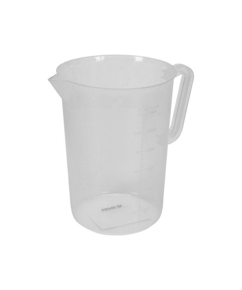 This 3000 ml jug features optimal dimensions: 170 mm in diameter and 230 mm in height. Its transparent, milky walls provide excellent visibility of the contents, facilitating control. A key element is the precisely embossed scale, expressed in both liters and milliliters, which allows for extremely accurate measurement of every, even the smallest, amount of product.