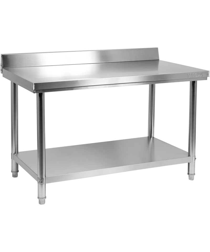 The solid table top, made of massive sheet metal with a thickness of 0.8 mm, is additionally equipped with reinforcing profiles. From below, it is reinforced with a 20 mm thick laminated wooden board, which not only stiffens the structure and dampens noise but also provides moisture resistance. This solution guarantees an impressive load capacity of the top up to 150 kg. What's more, the back part of the top has a practical upstand with a height of 100 mm, which, when the table is moved against a wall, effectively prevents food debris from falling behind, significantly raising work hygiene standards.
