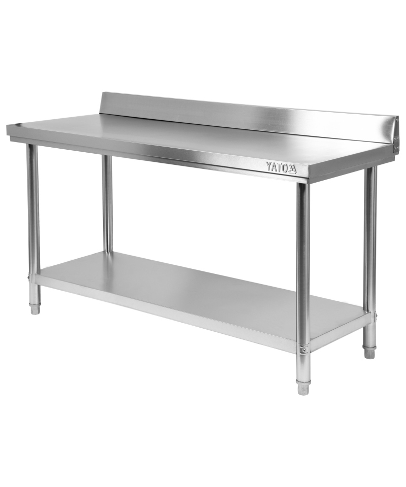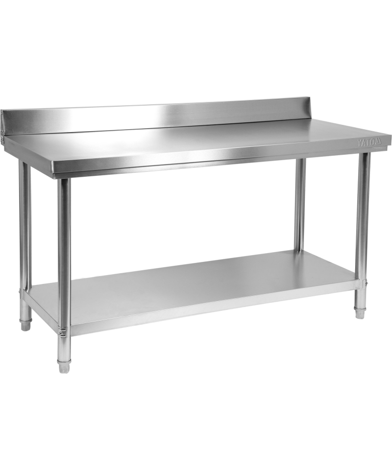 The solid table top guarantees durability. Made from a massive sheet of 0.8 mm thickness, it has been additionally reinforced with stiffening profiles. From below, the top is supported by a 20 mm thick laminated wooden board, which not only increases its stability and dampens sound but also provides moisture resistance. Thanks to this advanced construction, the top achieves an impressive load capacity of up to 150 kg. What's more, the rear upstand with a height of 100 mm effectively prevents food residues from falling behind the table when it is placed against a wall, significantly raising hygiene standards in the workplace.