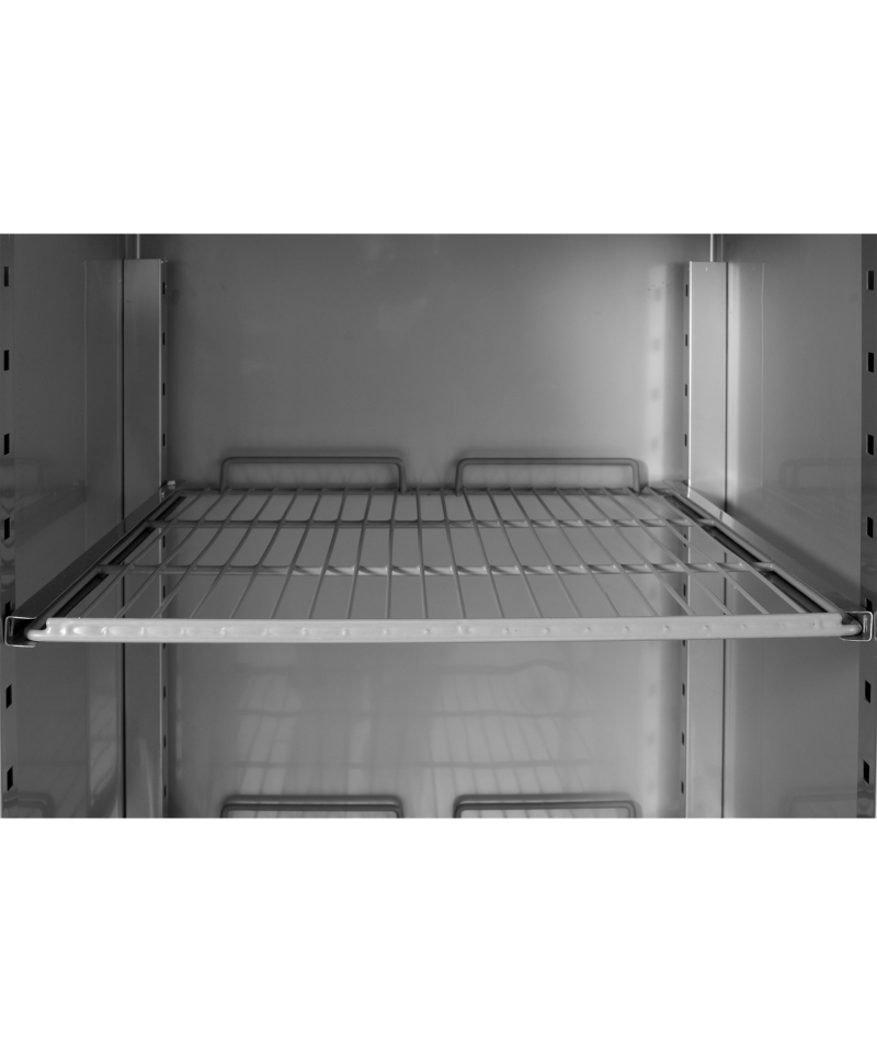 Functionality is enhanced by the self-closing door system, which for safety is equipped with a lock and an ergonomic handle. The interior of the cabinet accommodates 3 PVC-coated grid shelves, each with an impressive load capacity of up to 40 kg (with even load), ideal for storing GN 2/1 containers. Additionally, the refrigeration chamber has energy-efficient LED lighting, ensuring excellent visibility.