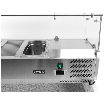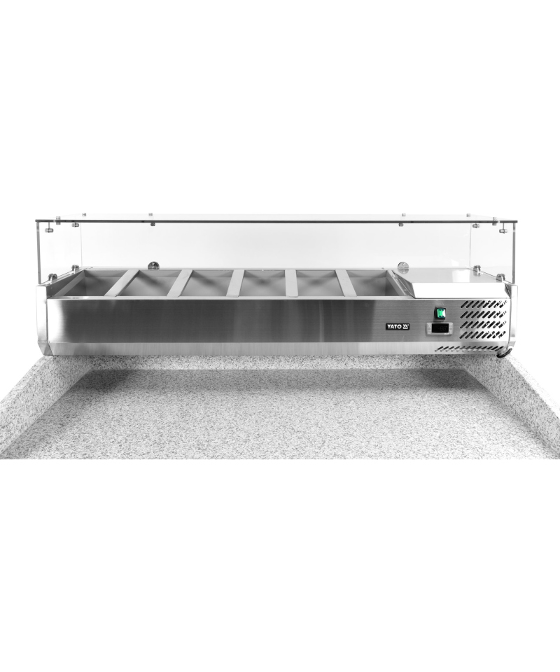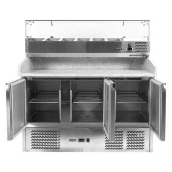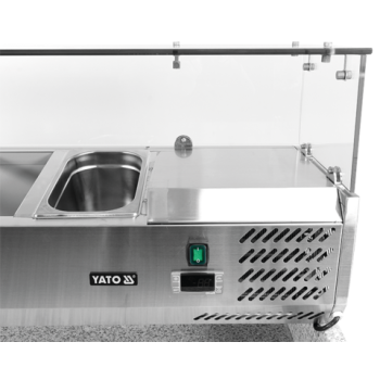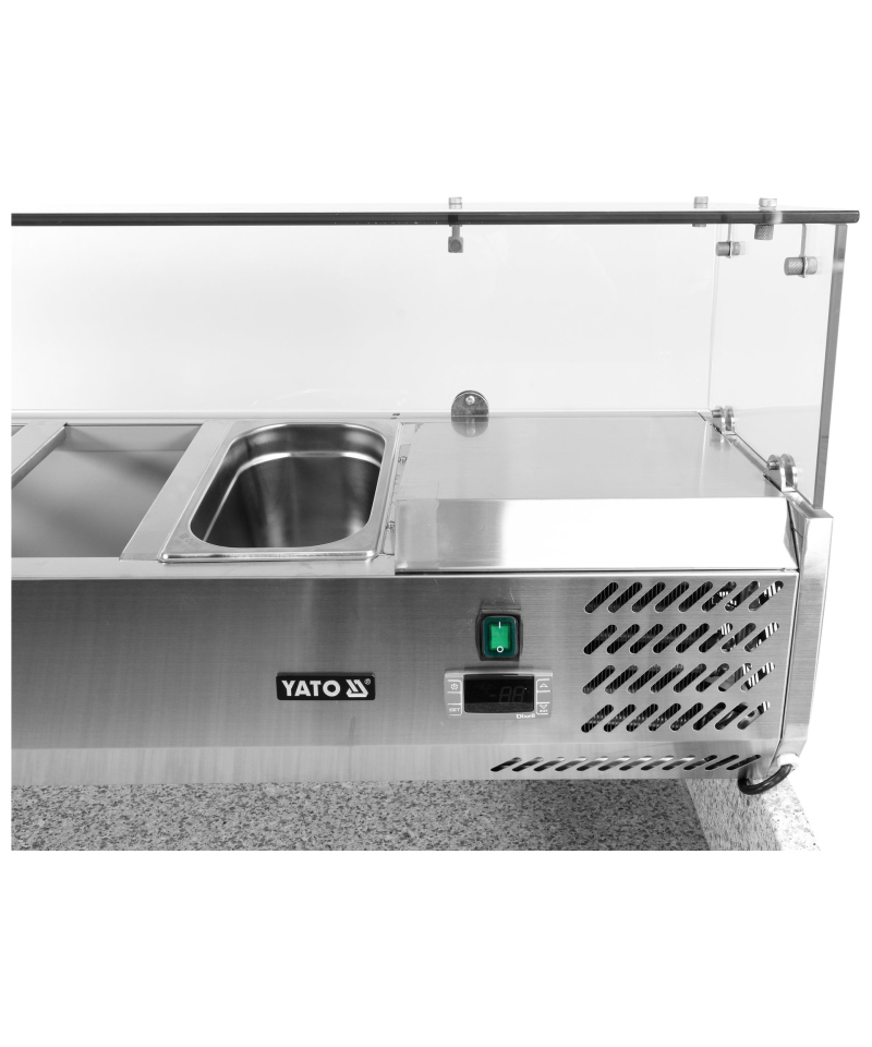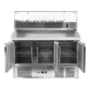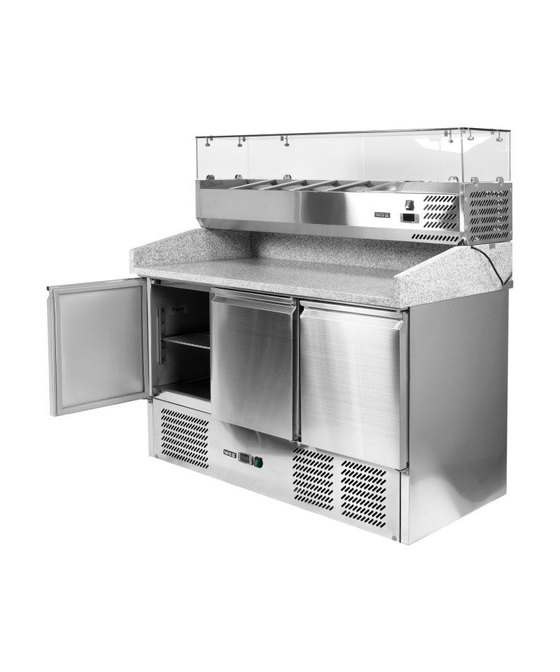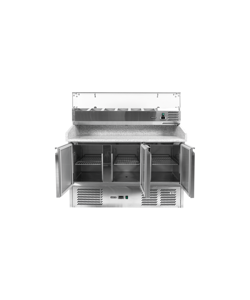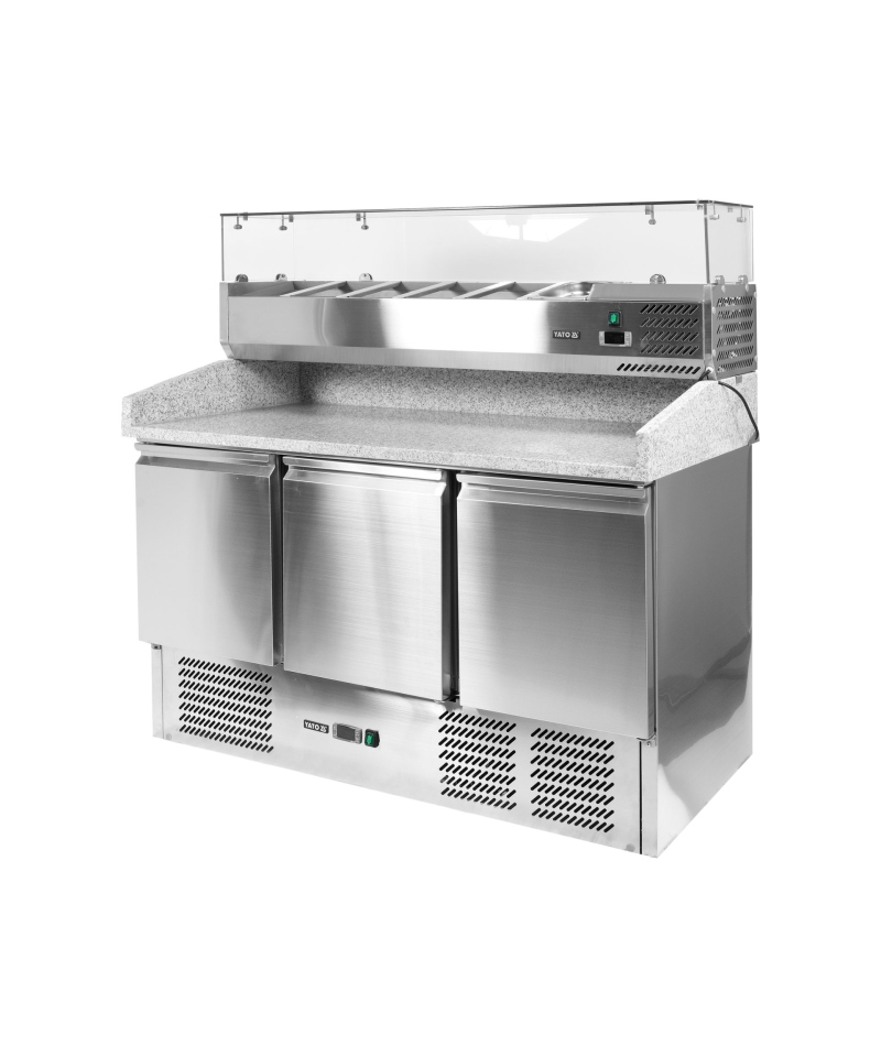 We present the 3-door refrigerated counter by YATO, model YG-05275, equipped with a solid granite worktop and a practical topping unit for 6 GN 1/4 containers.