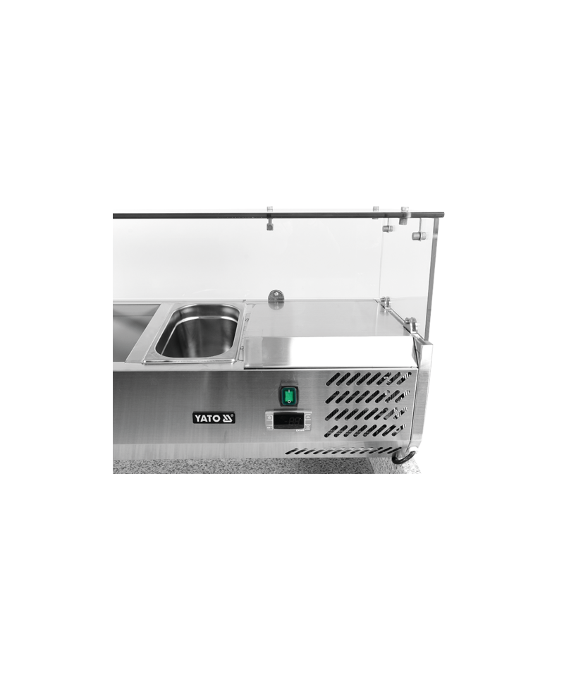 At the heart of the refrigerated counter is an efficient, bottom-mounted refrigeration unit with a power of 240 W, using the ecological refrigerant R290. It is adapted to operate in challenging conditions of climate class 4, which means efficient operation at a maximum ambient temperature of 300C and relative humidity of 55%. Power supply is 220-240 V ~50 Hz. The topping unit has its own refrigeration unit with a power of 110 W, operating on refrigerant R600a. Precise temperature control is provided by an electronic controller with a clear digital display. The average annual energy consumption is 1294 kWh.