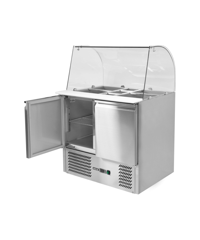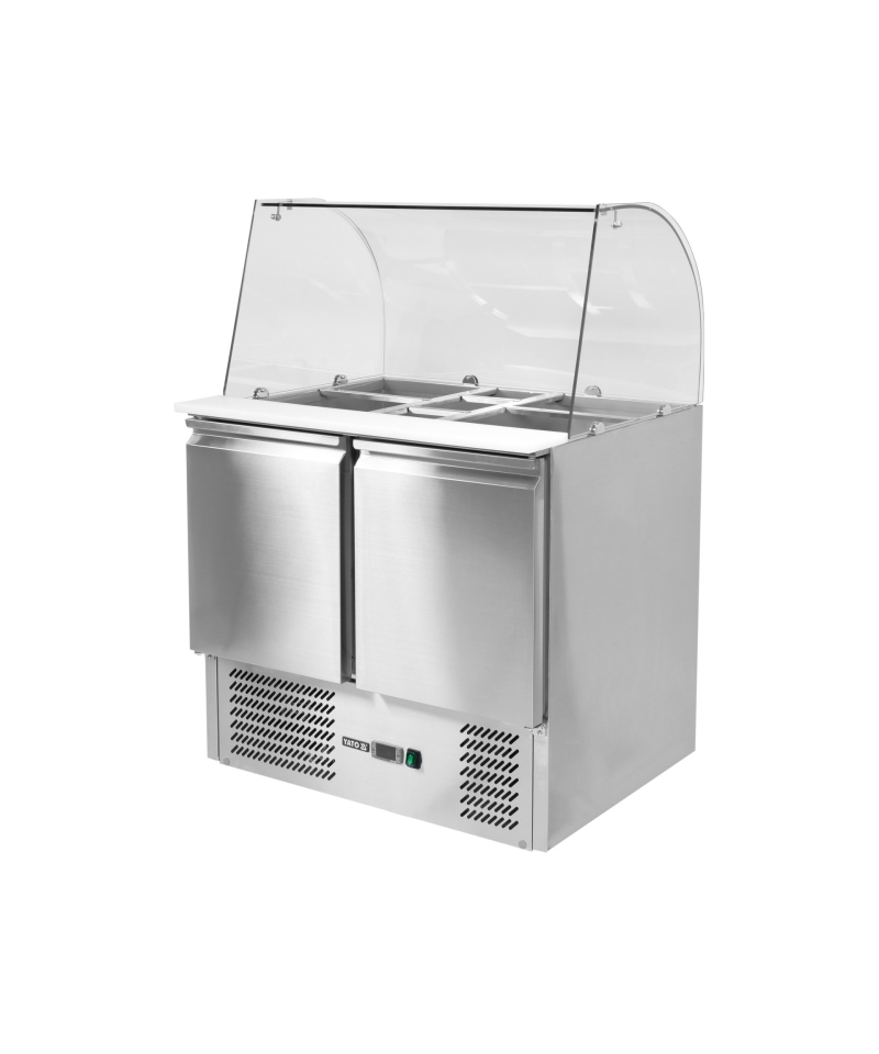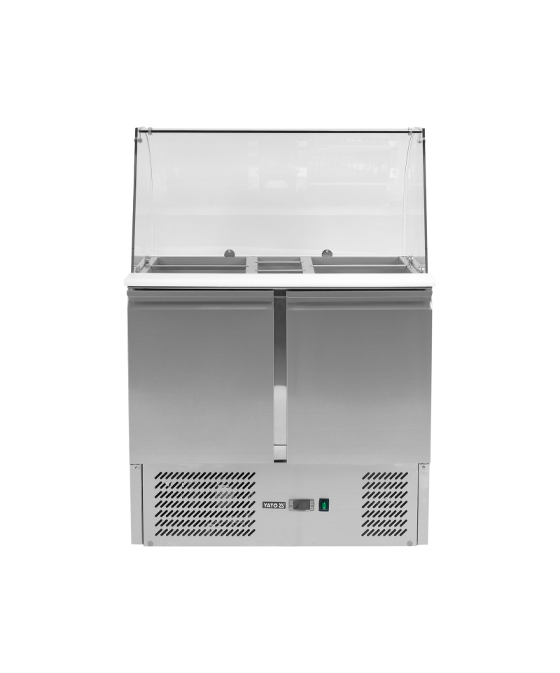 Introducing a professional 2-door refrigerated salad table with an elegant glass superstructure, model YG-05260, branded by YATO.