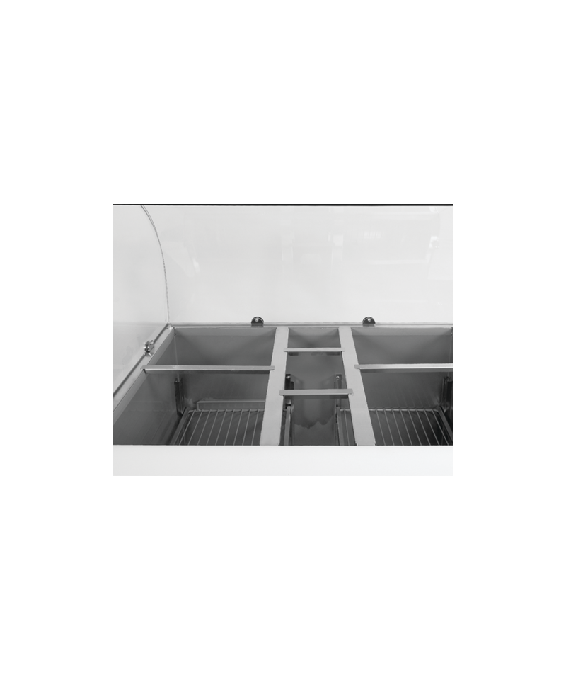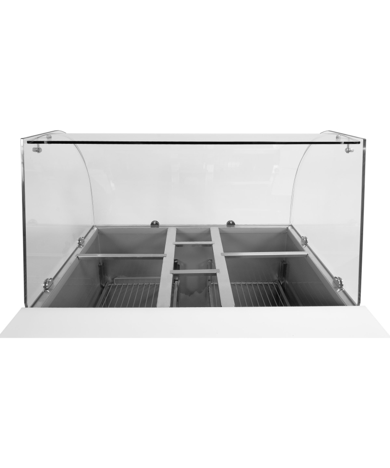 The table's functionality is enhanced by a practical auxiliary worktop made of durable polyethylene. Additionally, in the upper part, there is a specially designed opening for GN containers: 4x GN 1/2 and 3x GN 1/6, with a maximum depth of 150 mm. This solution allows for convenient and organized storage of a wide range of salad toppings and ingredients, always at hand. Please note that GN containers are not included in the set.